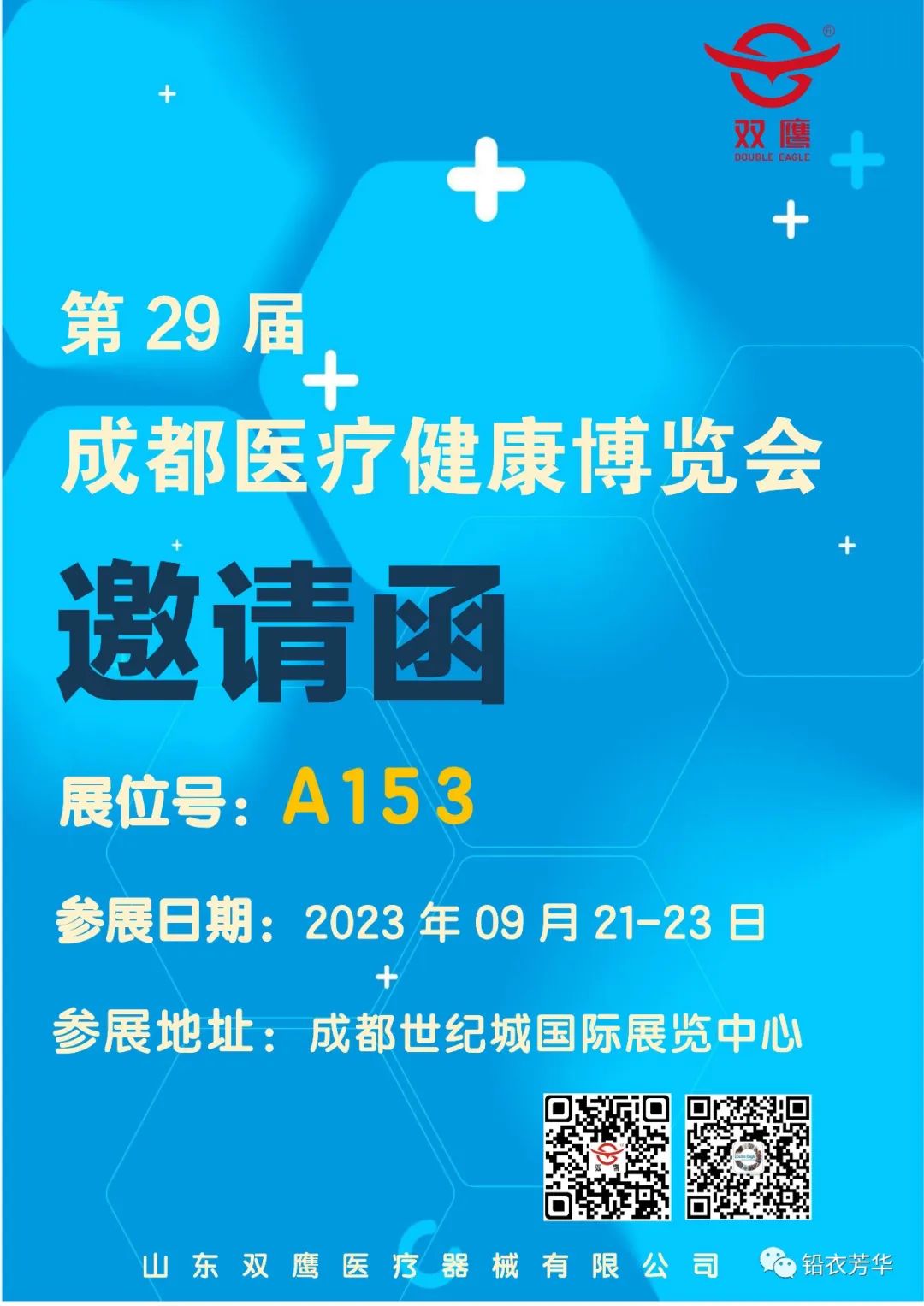 2023年9月21日-23日,第29届成都医疗健康博览会在成都世纪城国际展览中心隆重举行,届时双鹰医疗在7号馆A153号展位恭候您的光临!