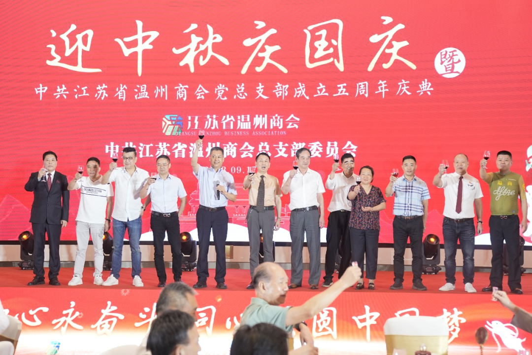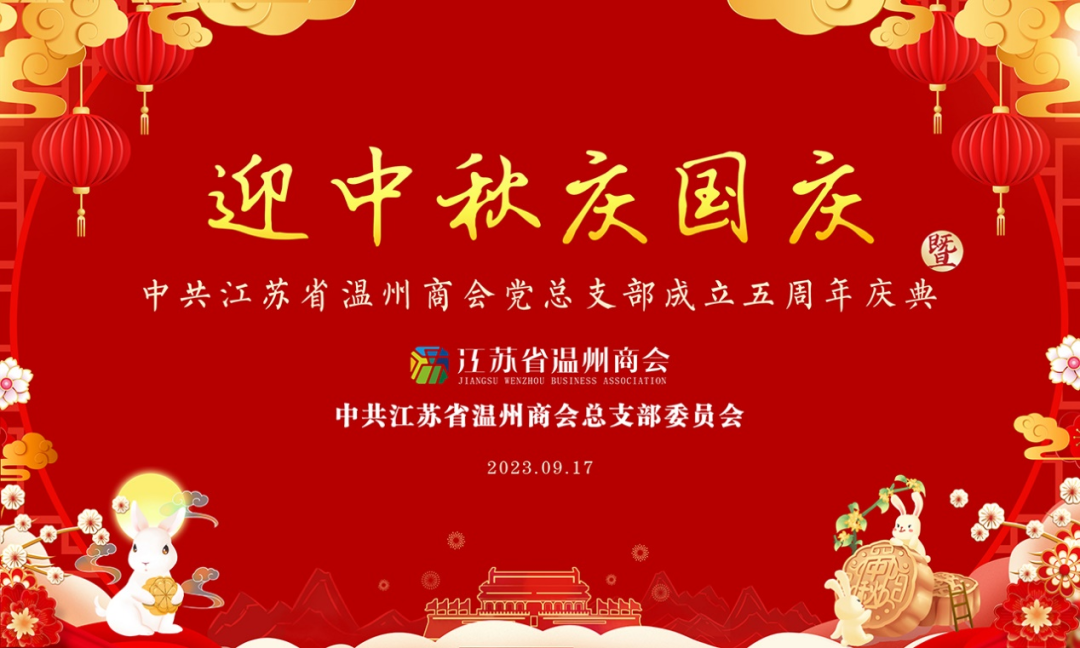 金秋送爽庆中秋,丹桂飘香贺国庆,2023年9月17日下午,江苏省温州商会在南京白金汉爵大酒店举办“迎中秋庆国庆暨中共江苏省温州商会党总支部委员会成立五周年庆典”联谊活动,政府部门领导、商会名誉会长、顾问及社会各界人士300多人欢聚一堂,共叙乡情、共庆佳节。