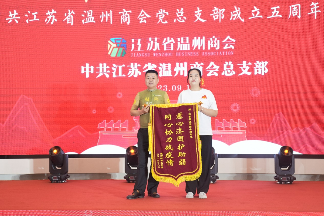 城河村社区党委领导为商会颁发“慈心济困护助弱,同心协力战疫情”的锦旗,表彰商会在防疫期间的突出贡献,江苏省温州商会党总支委员、骑行队支部书记林玉发代表商会接受了锦旗。