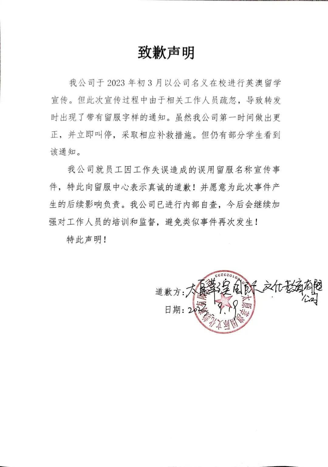 该公司作出致歉声明,如下: