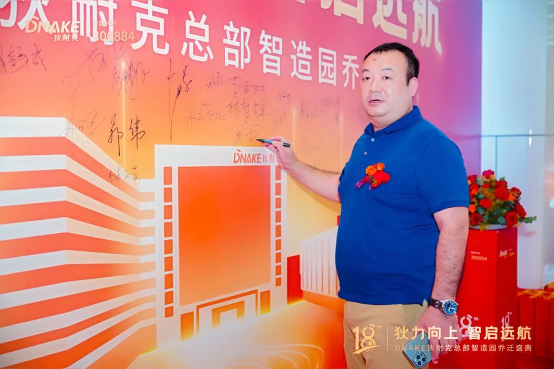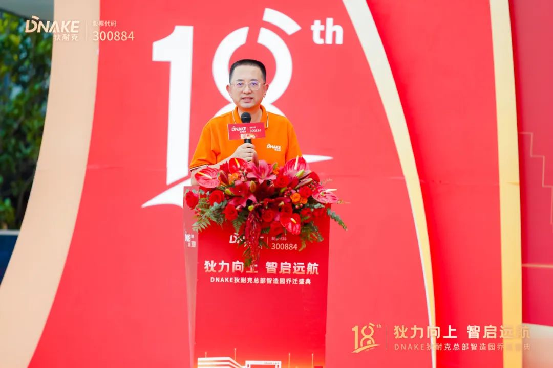 狄耐克董事长缪国栋在致辞中向莅临现场的领导、嘉宾、朋友们表示欢迎和感谢!向厦门市政府以及海沧区政府领导、合作伙伴、客户和供应商朋友们的信任和支持表示衷心感谢。他说狄耐克智造园的乔迁象征着我们实现高质量发展的愿望和决心,承载着公司完成更大宏图的美好憧憬,更承载着一千五百多名狄耐克人追求幸福的向往。现在,狄耐克将从这里出发,走向国际化视野,走向百亿企业,走向光明未来。