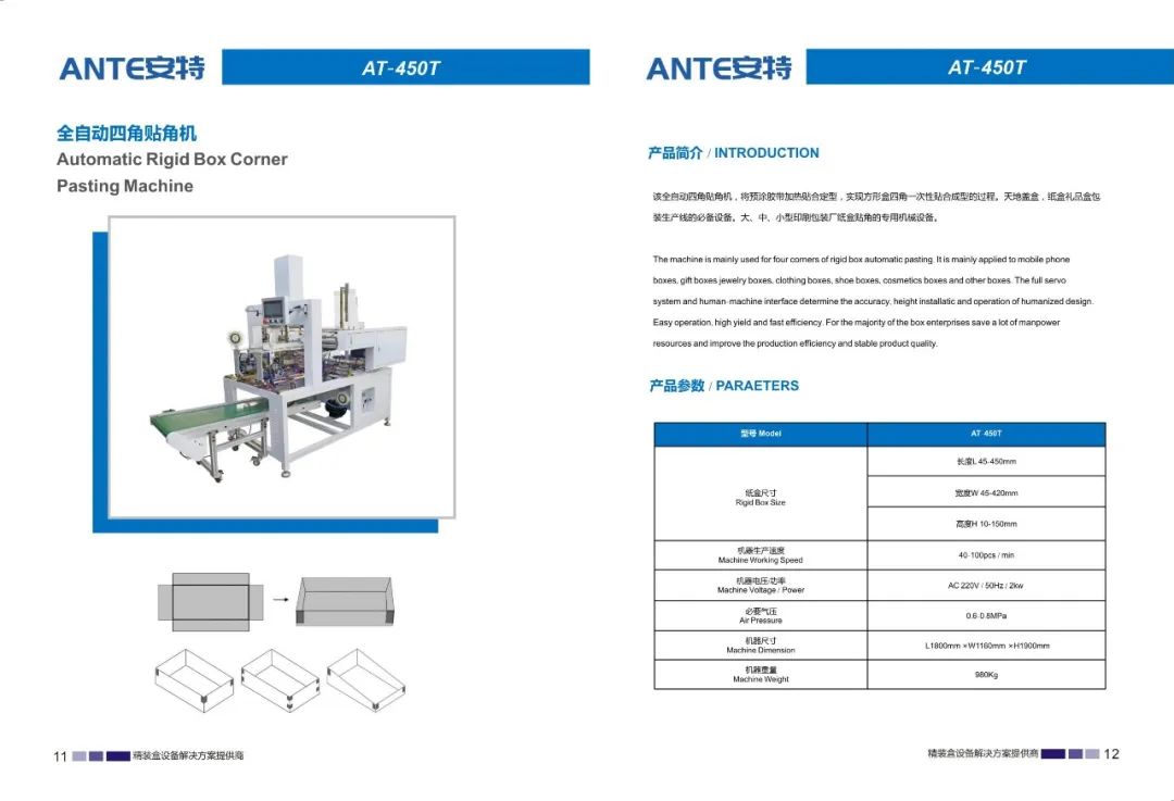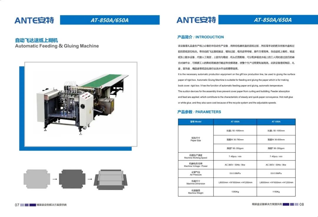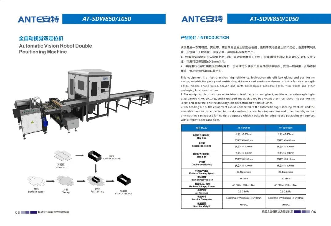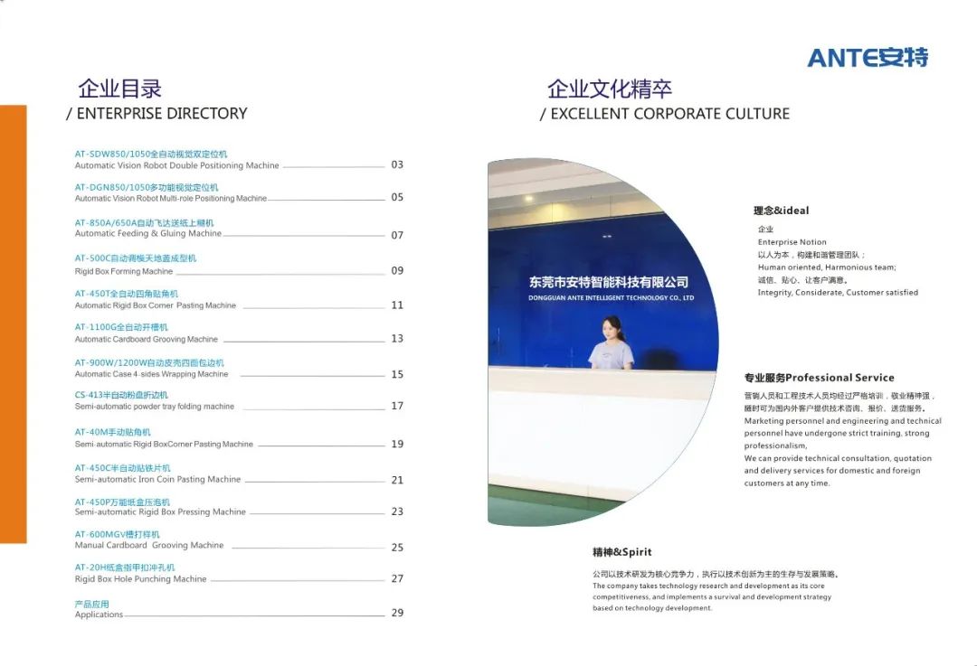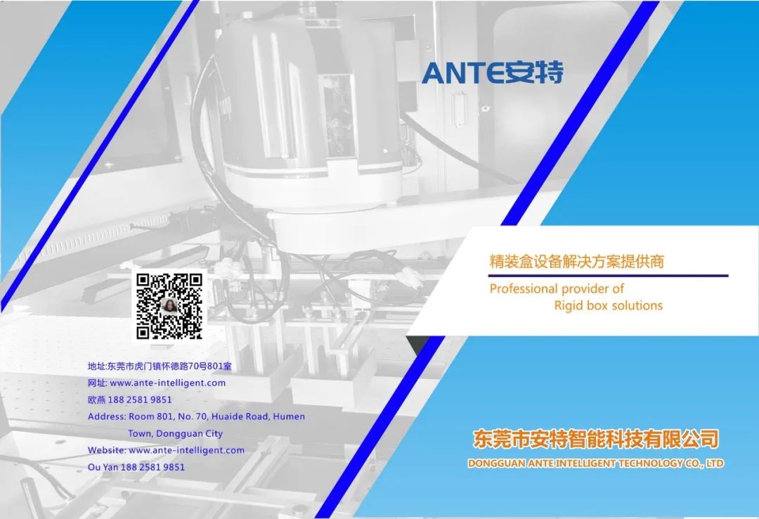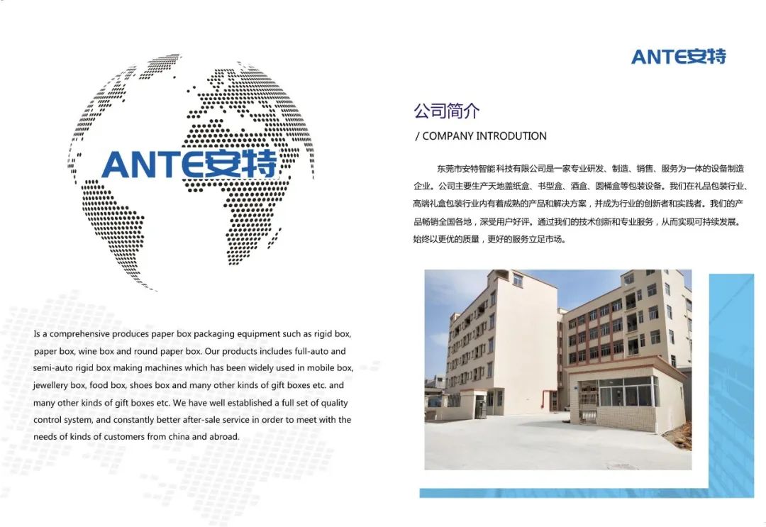 东莞市安特智能科技有限公司是一家专业研发、制造、销售、服务为一体的设备制造企业。公司主要生产天地盖纸盒、书型盒、酒盒、圆桶盒等包装设备。我们在礼品包装行业、高端礼盒包装行业内有着成熟的产品和解决方案,并成为行业的创新者和实践者。我们的产品畅销全国各地,深受用户好评。通过我们的技术创新和专业服务,从而实现可持续发展。始终以更优的质量,更好的服务立足市场。