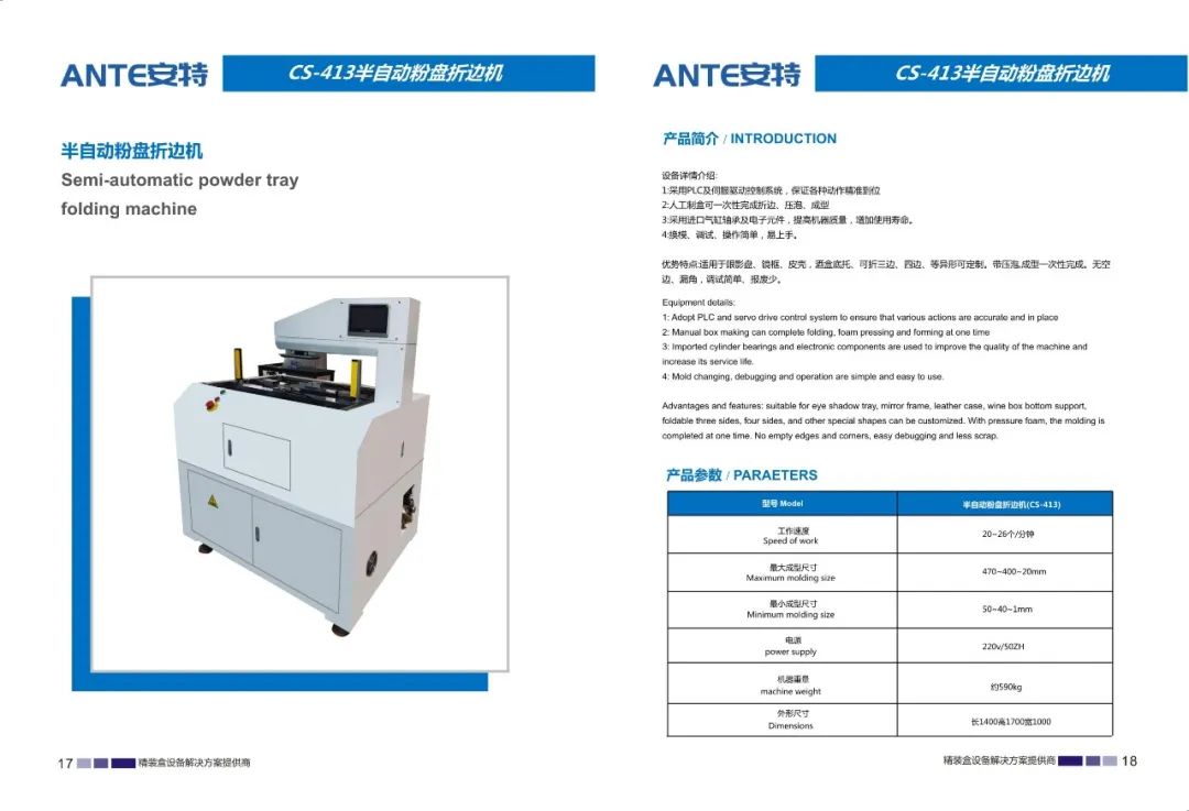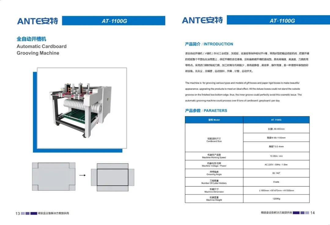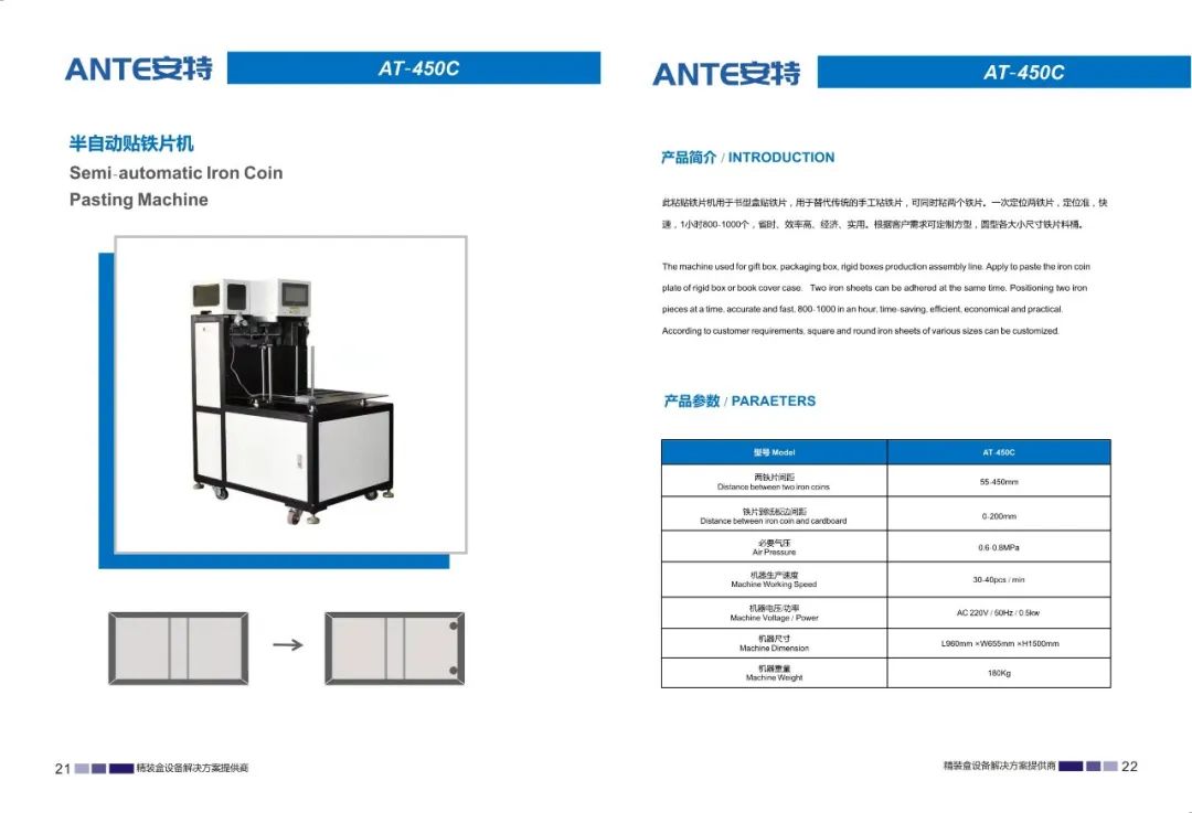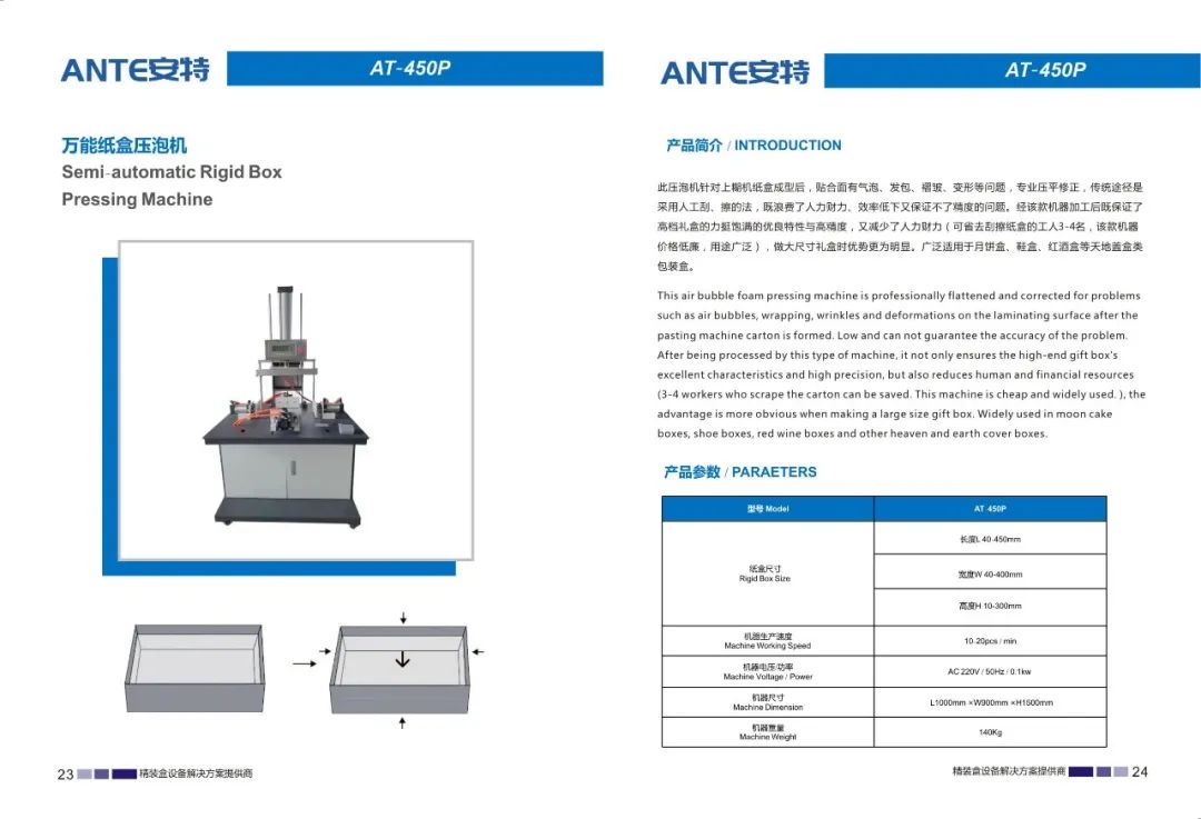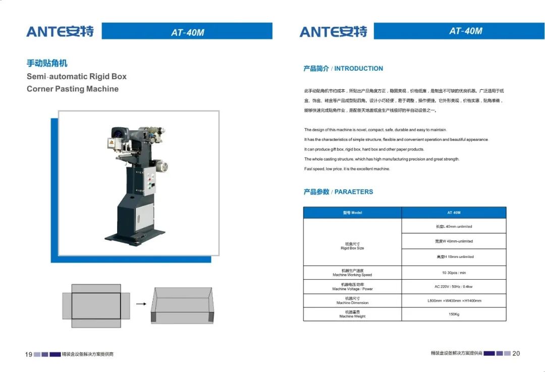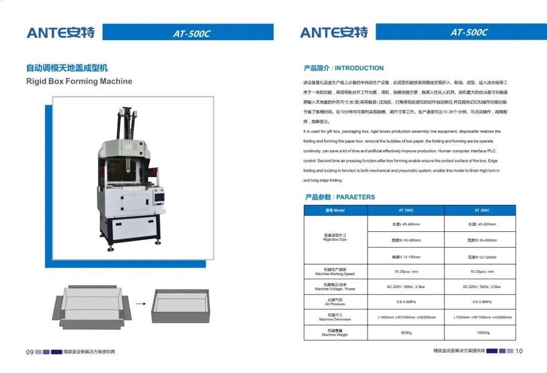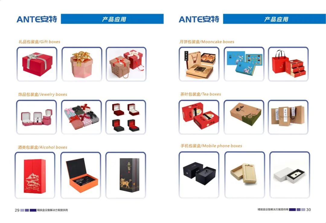 东莞市安特智能科技有限公司是一家专业研发、制造、销售、服务为一体的设备制造企业。公司主要生产天地盖纸盒、书型盒、酒盒、圆桶盒等包装设备。我们在礼品包装行业、高端礼盒包装行业内有着成熟的产品和解决方案,并成为行业的创新者和实践者。我们的产品畅销全国各地,深受用户好评。通过我们的技术创新和专业服务,从而实现可持续发展。始终以更优的质量,更好的服务立足市场。