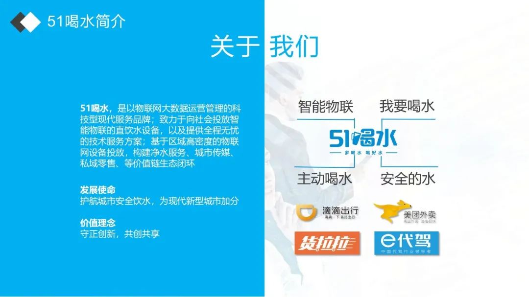 51喝水,是以物联网大数据运营管理的科技型现代服务品牌;致力于向社会投放智能物联的直饮水设备,以及提供全程无忧的技术服务方案;基于区域高密度的物联网设备投放,构建净水服务、城市传媒、私域零售、等价值链生态闭环。