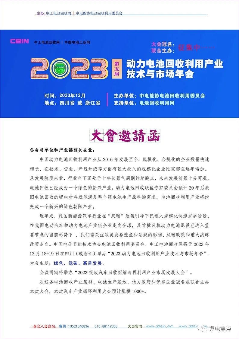 2023动力电池回收利用产业技术与市场年会将于2023年12月18-19日举办
