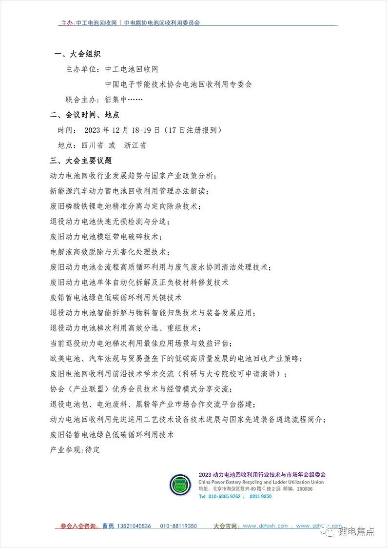 2023年中国动力电池回收年会,请咨询:曹勇,电话:135-2104-0836(同微信)