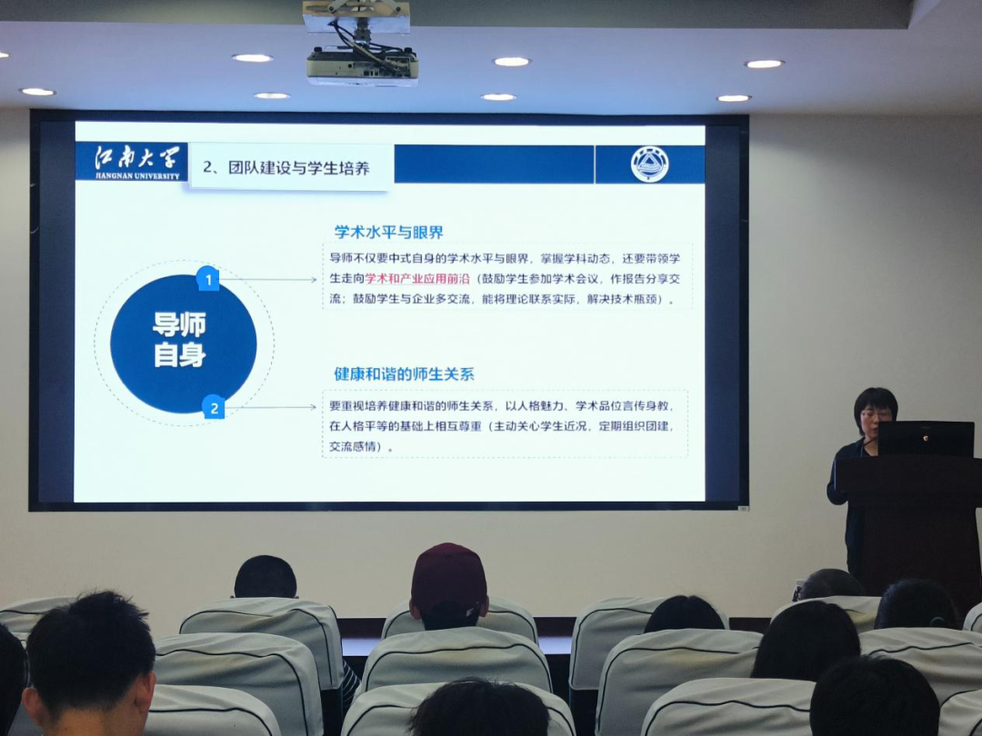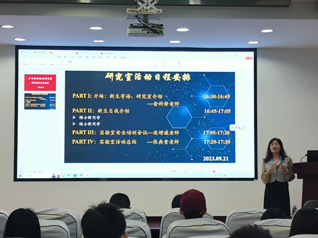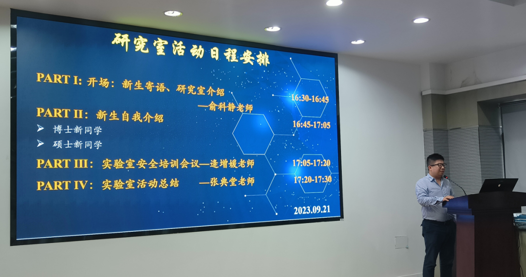 俞科静教授首先向新生介绍了团队导师以及各自的研究领域,接着发表了一些关于团队建设和学生培养的独到见解。俞科静教授希望同学们能够积极主动,高效地沟通与汇报,把握好自己课题的节点。最后俞科静教授送给同学们16字”既往不恋,未来不迎,物来顺应,当时不杂“,希望同学们在新学期能够一往无前,取得好成果。