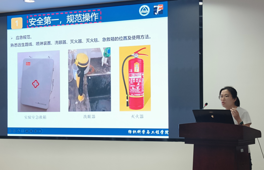 随后逄增媛副研究员为研究生新生们介绍了实验室安全常识与管理规定。就实验室中涉及消防安全、用电安全、设备安全、人身安全等方面的注意事项和操作要求进行了细致的讲解,并就实验室购存货的相关要求和填报流程进行介绍,呼吁同学们共同努力,将实验室安全意识潜移默化至科研学习生活中的方方面面,杜绝侥幸心理,为了个人安全更为了所有人的安全,打造产业用纺织品研究室安全可靠的实验空间。