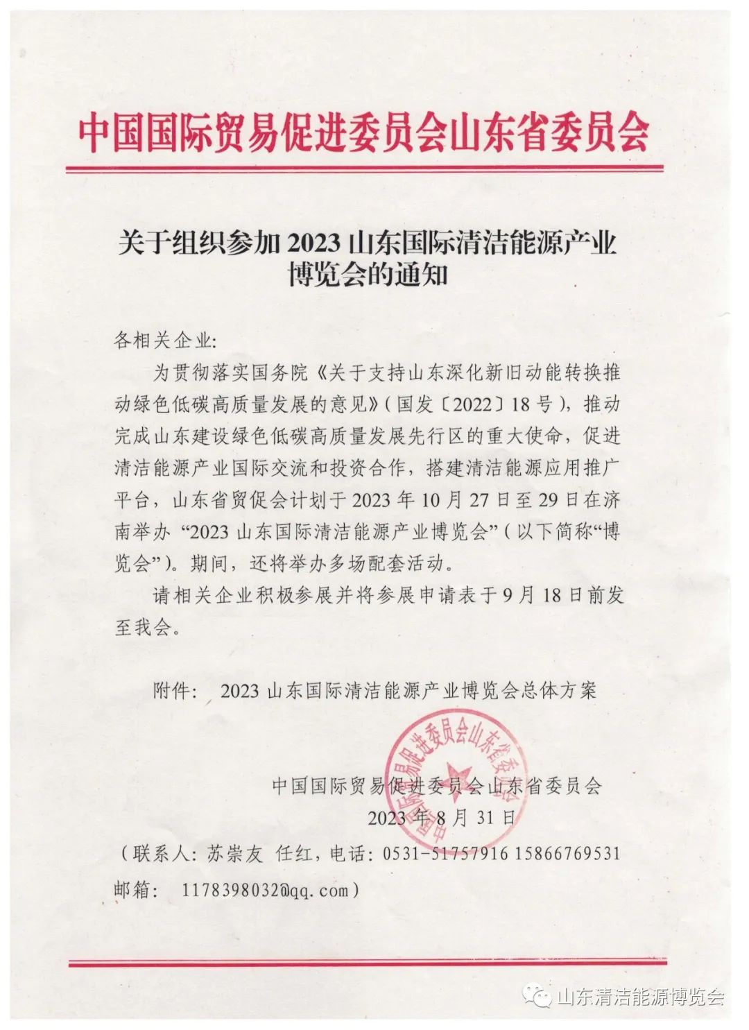 为贯彻落实国务院《关于支持山东深化新旧动能转换推动绿色低碳高质量发展的意见》(国发【2022】18号),推动完成山东建设绿色低碳高质量发展先行区的重大使命,促进清洁能源产业国际交流和投资合作,搭建清洁能源应用推广平台,山东省贸促会计划于10月27日至29日在山东国际会展中心举办“2023年山东国际清洁能源产业博览会”。