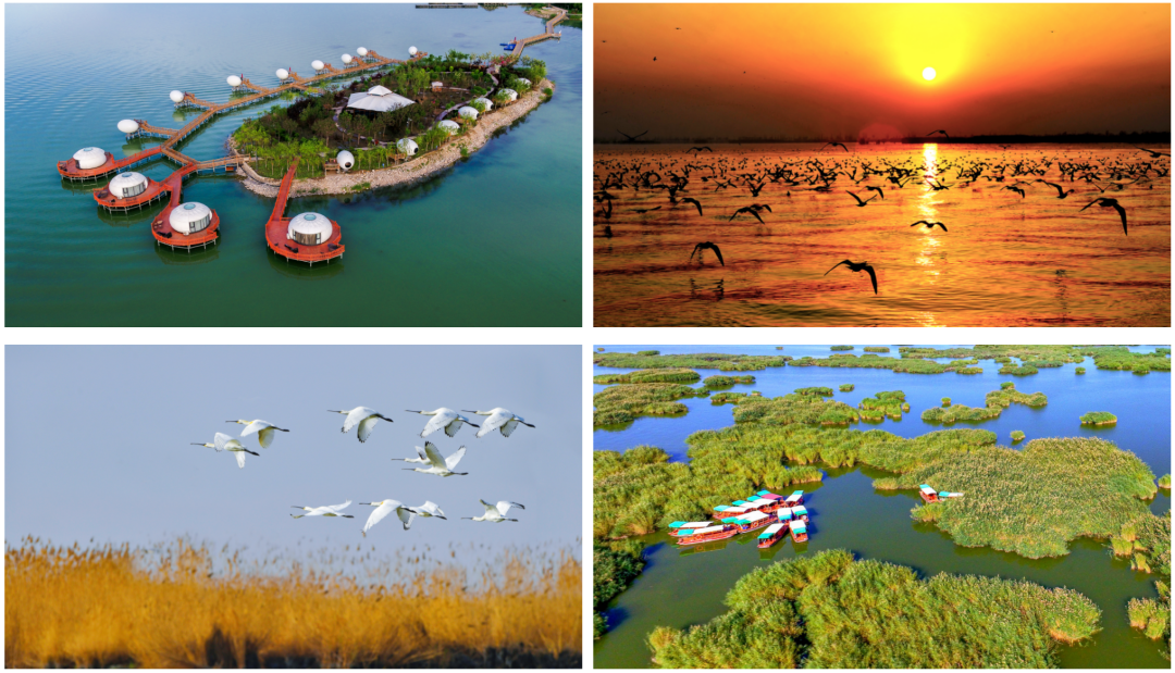 置身鸣翠湿地,朝霞漫天、湖光潋滟、芦苇荡漾、杨柳依依、鱼翔浅底、百鸟鸣翠,不是江南胜似江南。
