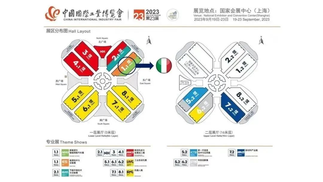 意大利馆由中国意大利商会和意大利对外贸易委员会上海办事处共同主办,位于1.1号馆新能源汽车展区,如下图所示。