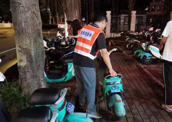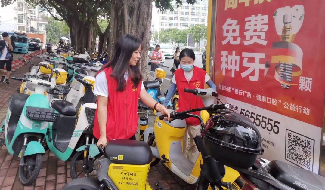 志愿者们将人行道上乱停乱放的电动车摆放整齐