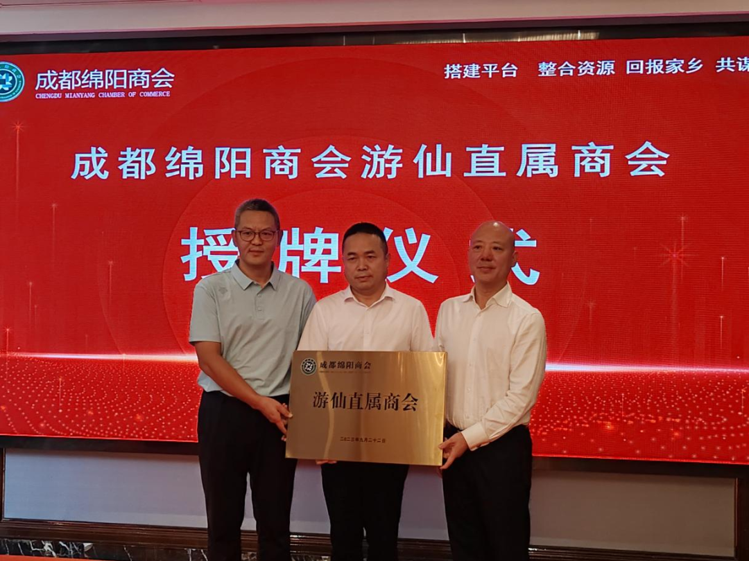 仪式上,成都绵阳商会、游仙区工商联共同为成都绵阳商会游仙直属商会授牌,在来自成游两地的嘉宾们共同见证下,成都绵阳商会游仙直属商会正式成立。成都绵阳商会游仙直属商会的成立,给在蓉游仙籍企业家们搭建起情感交流、资源共享、交流合作的平台,使两地企业共促共赢、共谋发展,同时为成游两地经济社会建设作出积极的贡献。