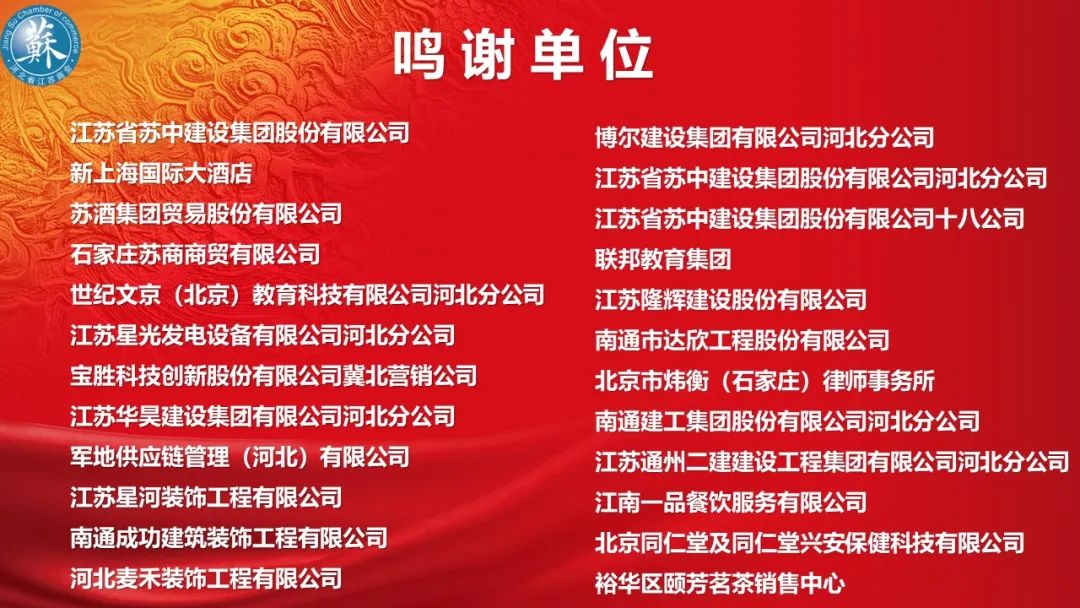 河北省江苏商会秉承厚德、崇文、实业、创新的新苏商精神,始终以总书记重要讲话精神为指引,坚持德高才能望众,厚德方能载物的文化理念,商会也逐渐形成了团结一心、众志成城的良好氛围。广大会员积极参与商会活动,发挥商会主人翁意识,此次联谊活动也得到了广大会员的积极支持与赞助。