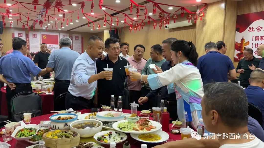 贵州省文化厅原副厅长邓健,贵州省布依学会常务副会长兼秘书长,贵州民族大学教授白明政,贵州省布依学会副会长、贵阳市布依学研究会会长,贵阳学院教授周国茂,黔西南州人民政府驻贵阳办事处主任、一级调研员蔡平、黔西南州人民政府驻贵阳办事处原主任、一级调研员席大中,贵州省职工书法家协会主席卢富华,民革中央企联会副秘书长、贵州学派学术委员会秘书长殷平以及黔西南在筑乡友代表,友好兄弟商协会代表等一百余位嘉宾到会欢聚一堂,共叙乡情,共话发展。