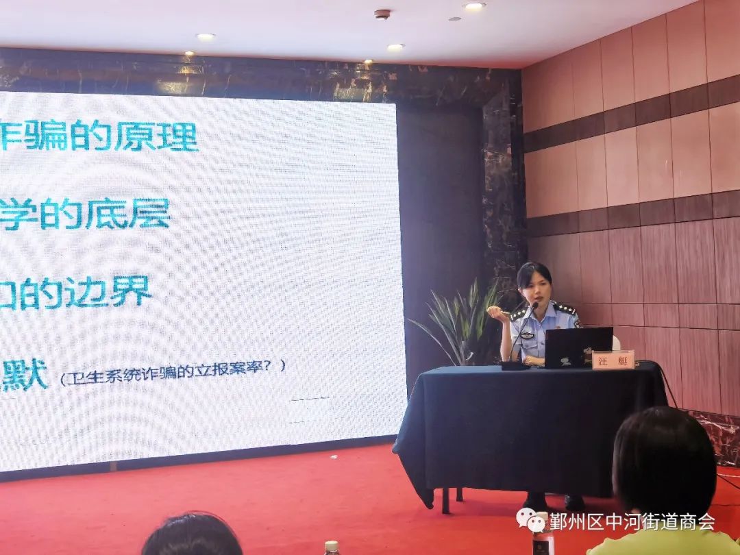 鄞州公安分局中河派出所汪艇警官从电信网络诈骗的概念、原理及发展史、常见电信诈骗手段类型、为什么要开展防范电信网络诈骗、怎样开展防范电信网络诈骗工作五个方面进行了讲解。详细剖析了电信网络诈骗对人民群众的危害,并利用现实案例提醒大家要时刻保持警惕,防止上当受骗。特别指出,随着互联网和智能手机的普及,电信网络诈骗的形式和手段日益多样化,建议企业家们在日常工作中,加强对员工的宣传教育,提高员工的反诈意识,以确保企业的财产安全和人身安全。此次培训会不仅增强了会员企业负责人的反诈意识,还提高了他们的防范能力,也标志着中河街道商会将进一步构建反电信网络诈骗宣传矩阵,筑牢防骗防护网,切实提高会员企业负责人防范“免疫力”,全力守好企业和员工的“钱袋子”。