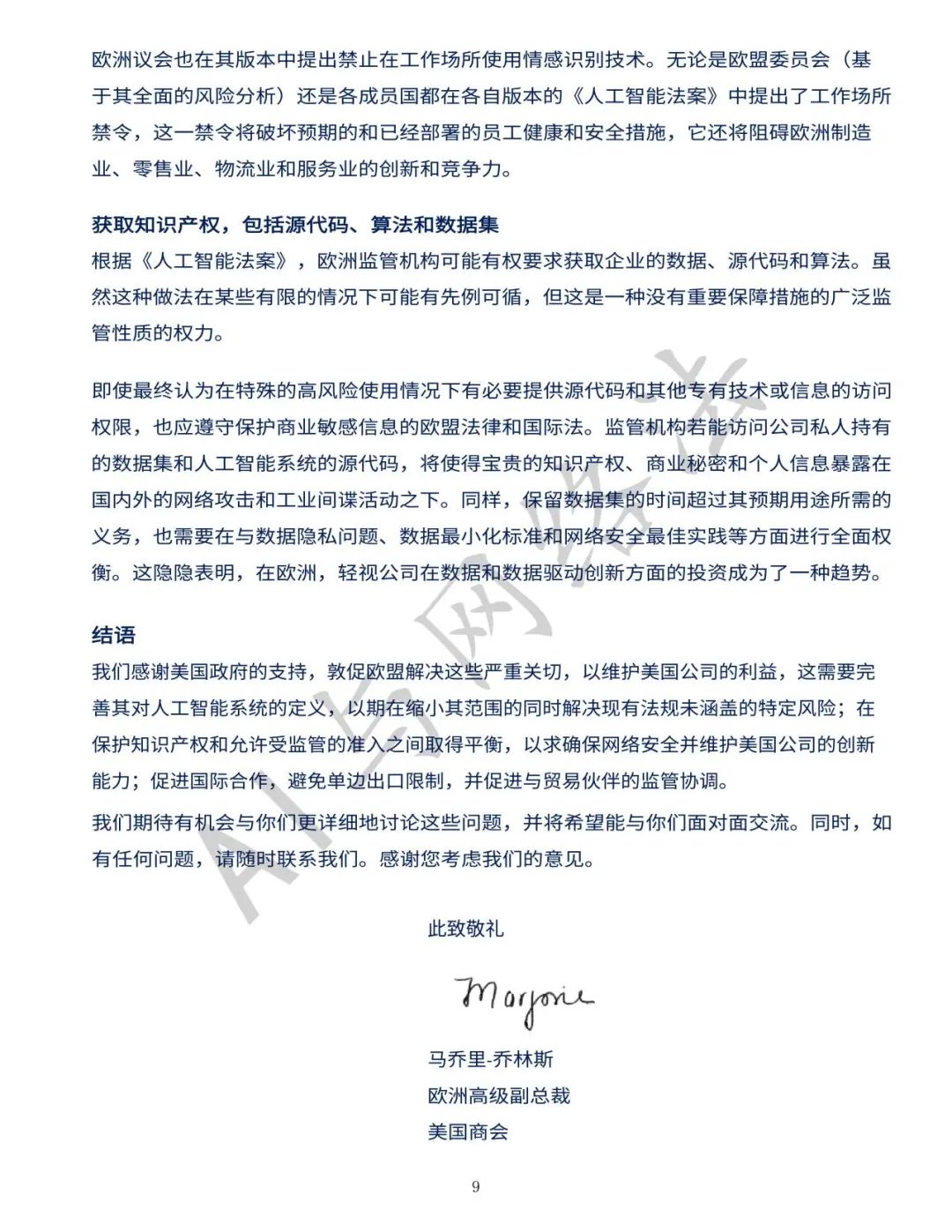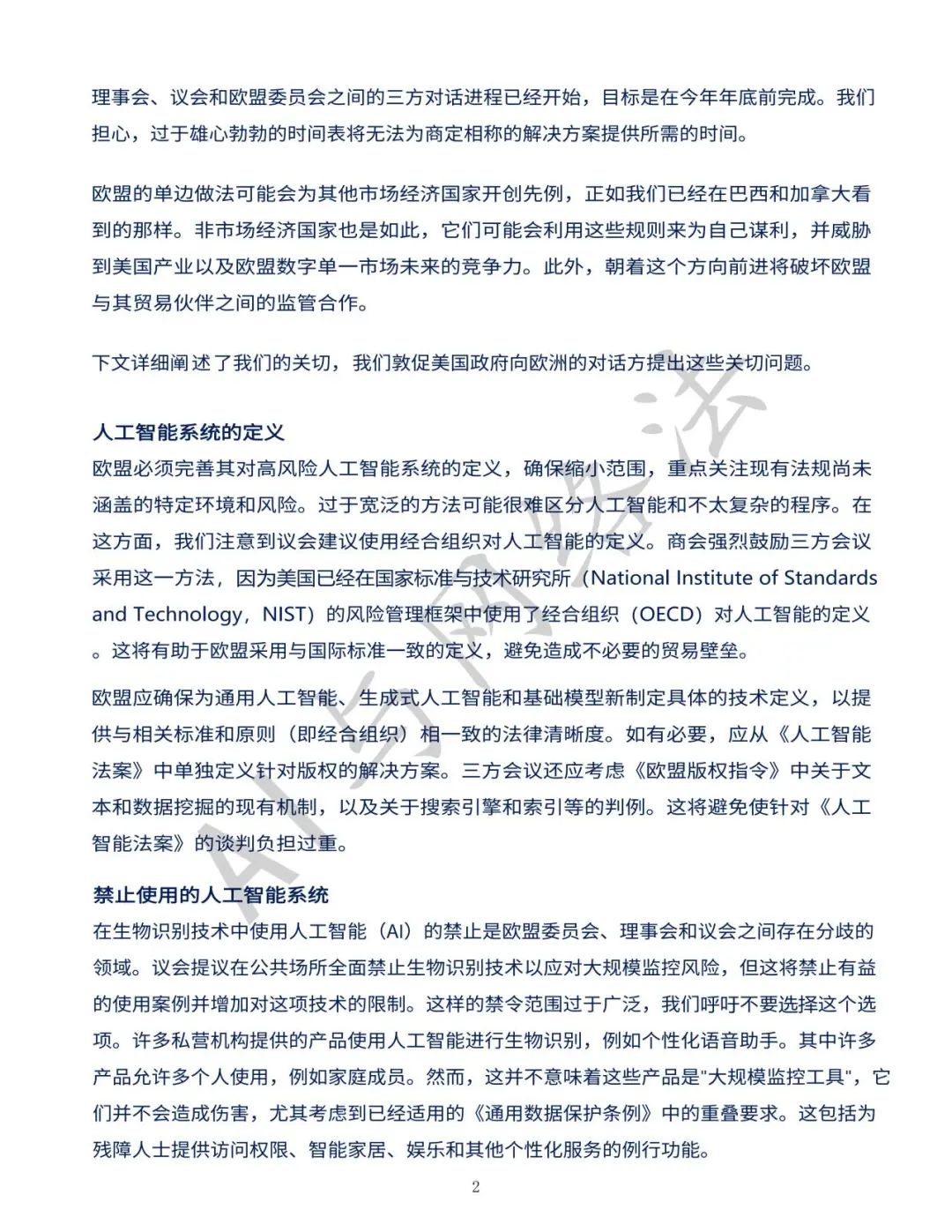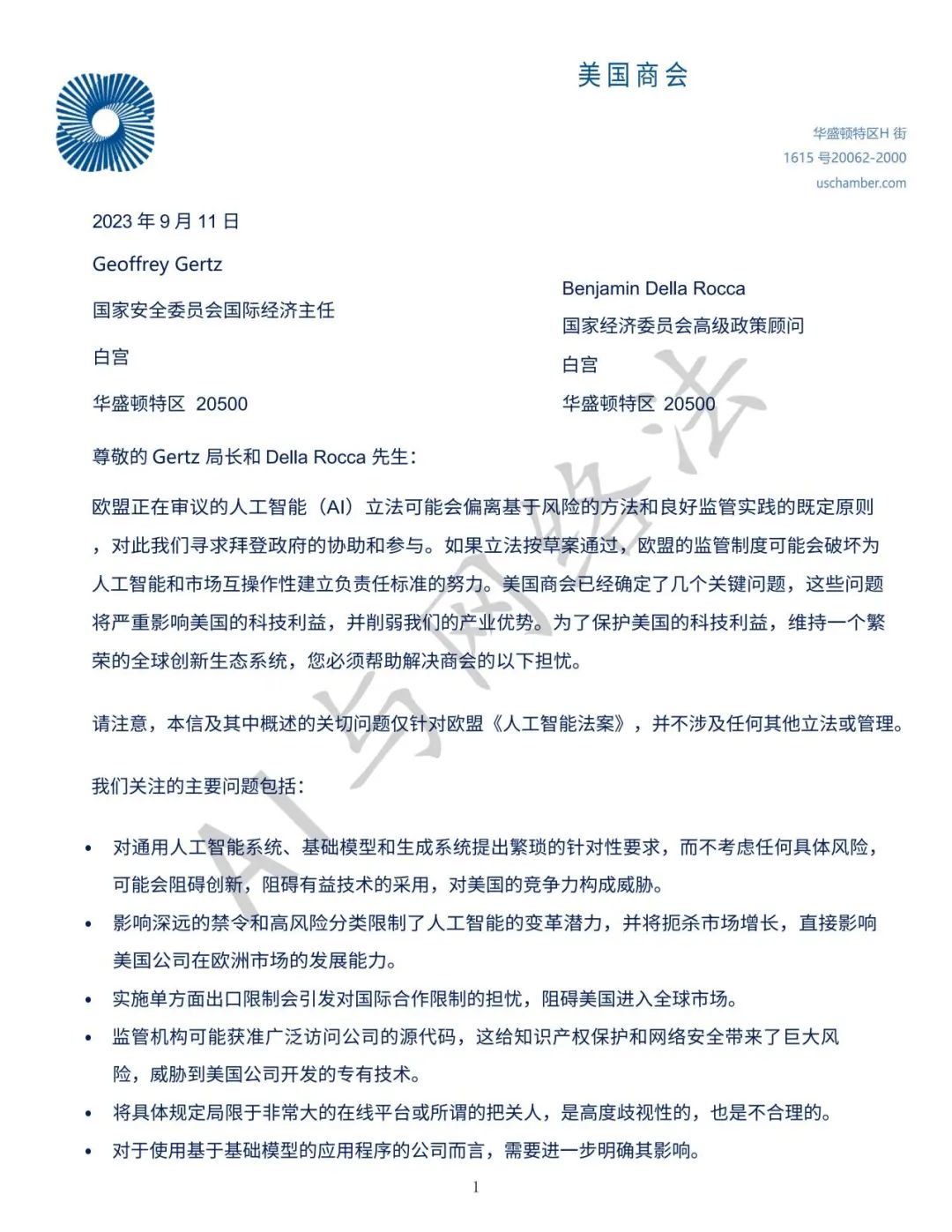 2023年9月11日(美国当地时间),美国商会(U.S. Chamber of Commerce)向拜登政府跨部门团队提交了一封信函,重点关注欧盟人工智能法案,概述了美国商界的主要担忧,包括以下要点: