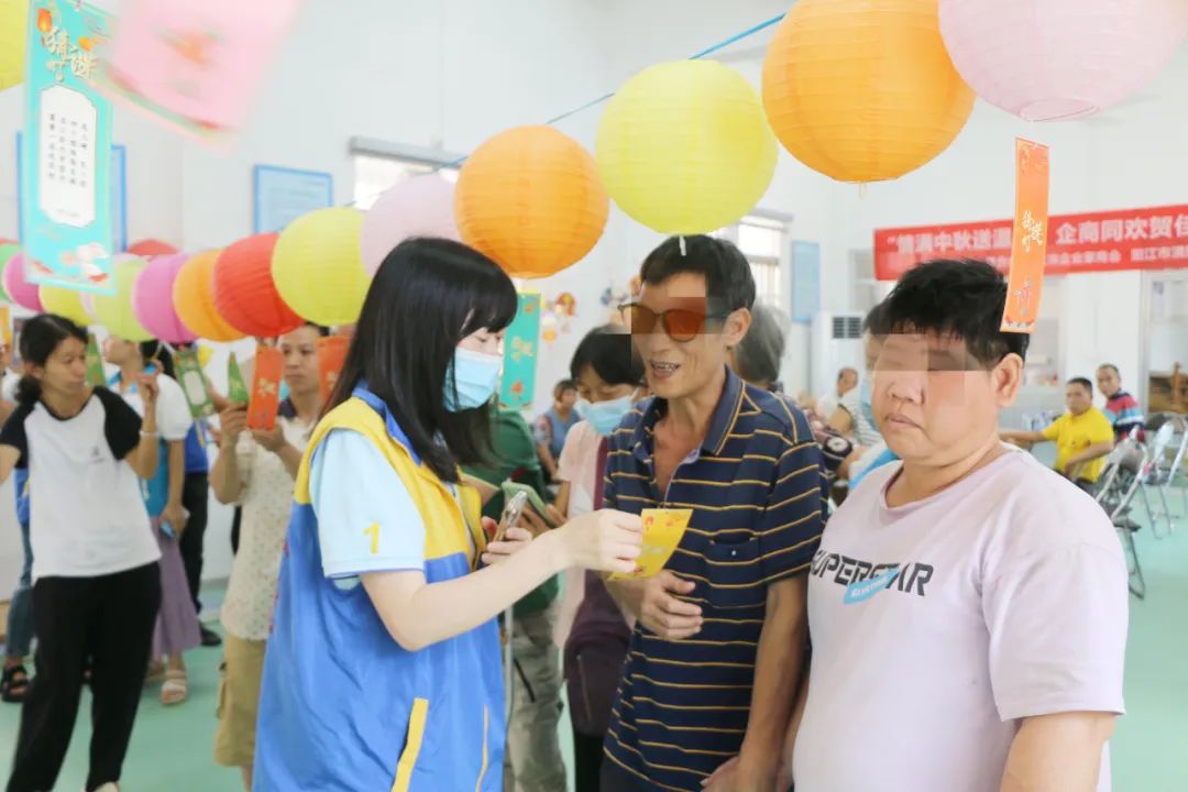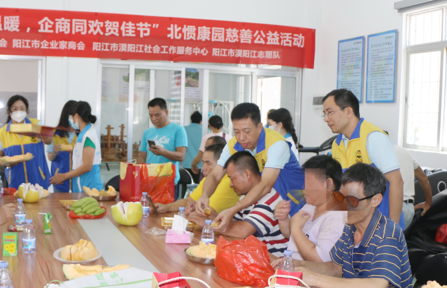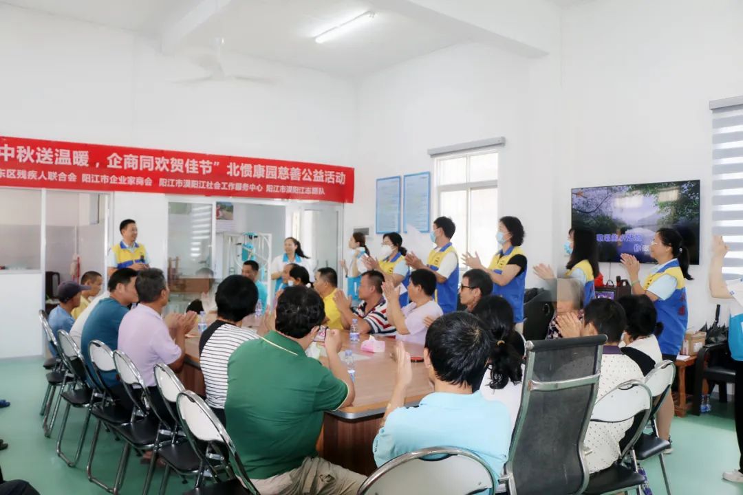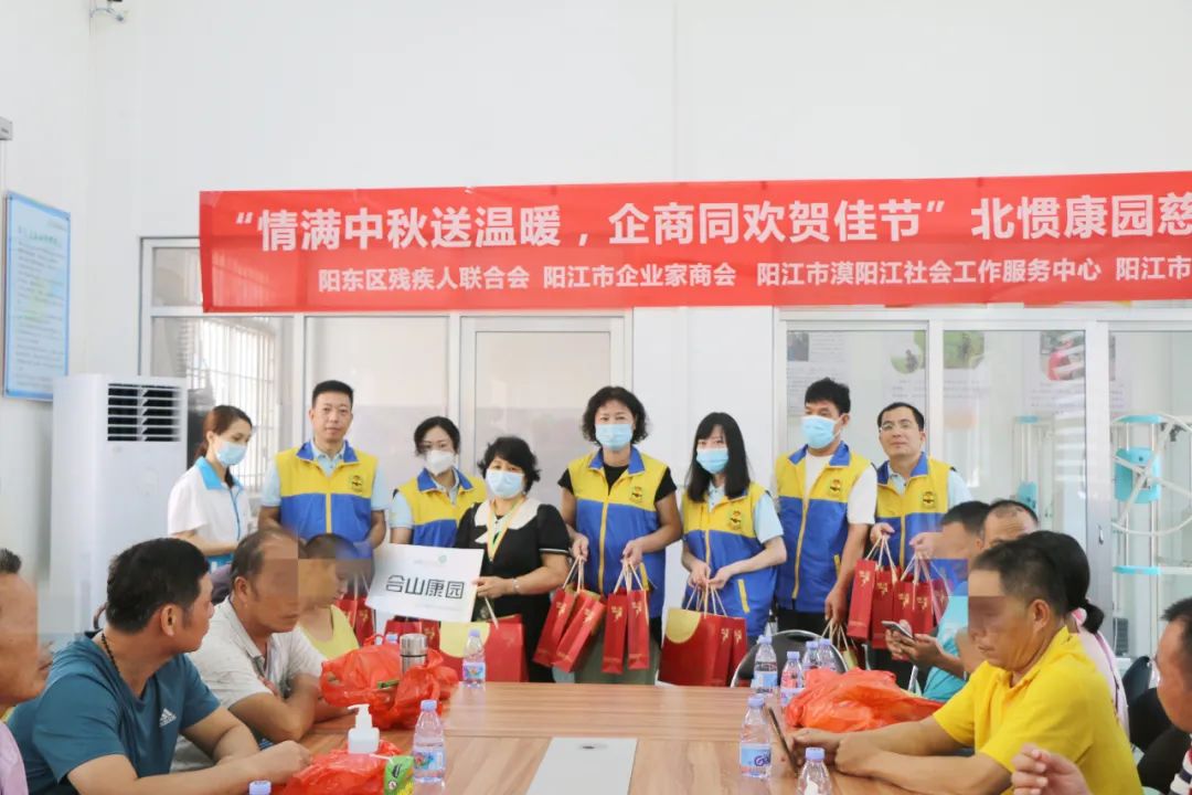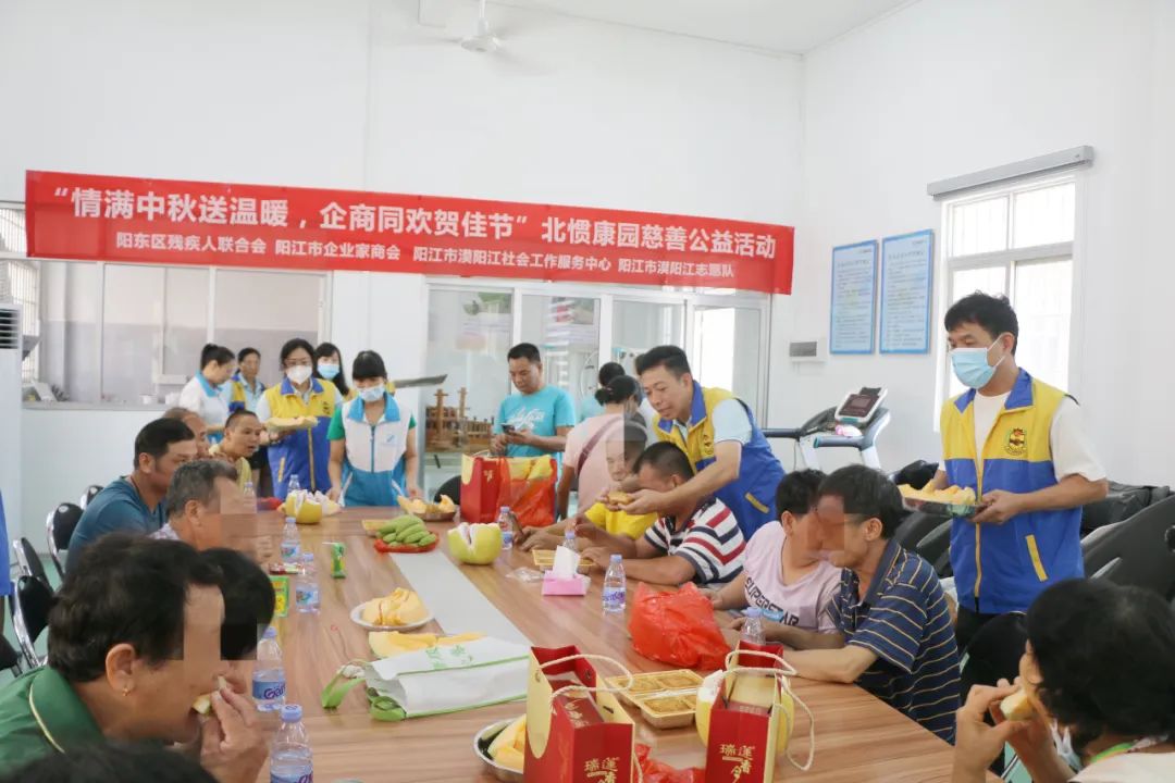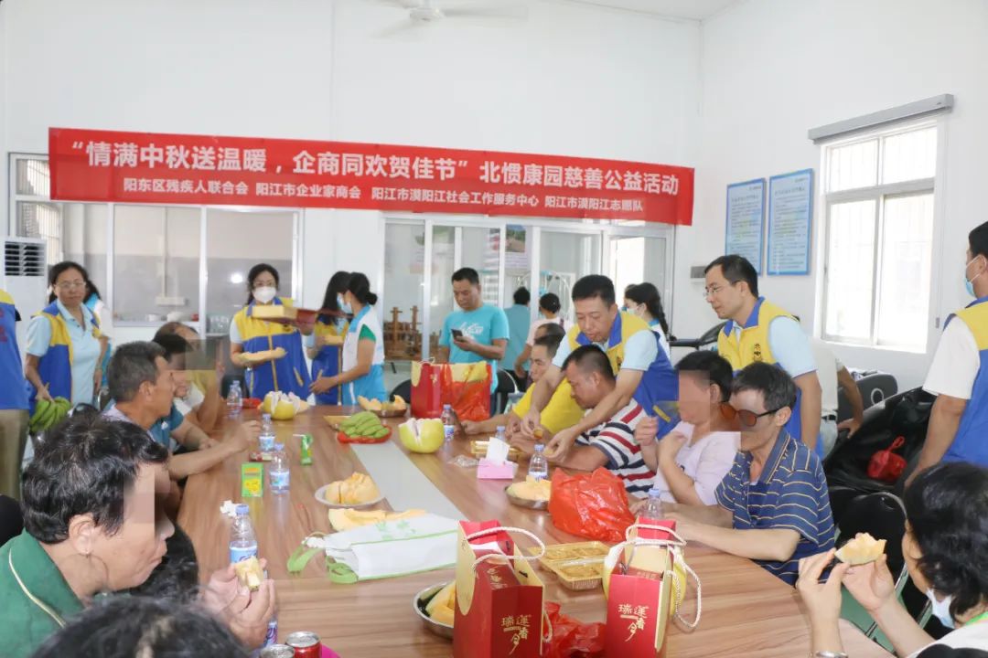 到中秋分外圆,情到深处暖人心。中秋佳节即将来临,9月22日上午,阳江市企业家商会联合阳东区残疾人联合会、阳江市漠阳江社会工作服务中心、阳江市漠阳江志愿队,在北惯镇康园中心开展“情满中秋送温暖,企商同欢贺佳节”慈善公益活动,让北惯、合山周边一带60多名残疾人感受到来自社会各界的温暖和关爱,为身处困境中的残疾人士送去节日的祝福和问候。