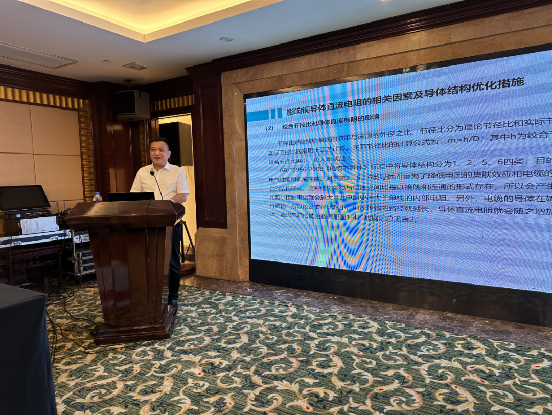 山东日辉电缆集团有限公司质量总监许璞作《线缆产品结构优化及新产品新技术的应用》主题报告。许璞从铜导体结构优化设计、绝缘和护套材料及功能性辅助材料的选用等方面进行干货满满的分享,并结合目前业内相关领域的新产品、新材料、新技术和新动态作了精彩汇报。
