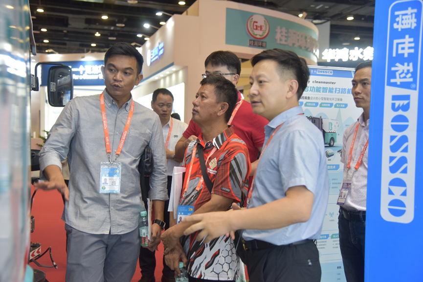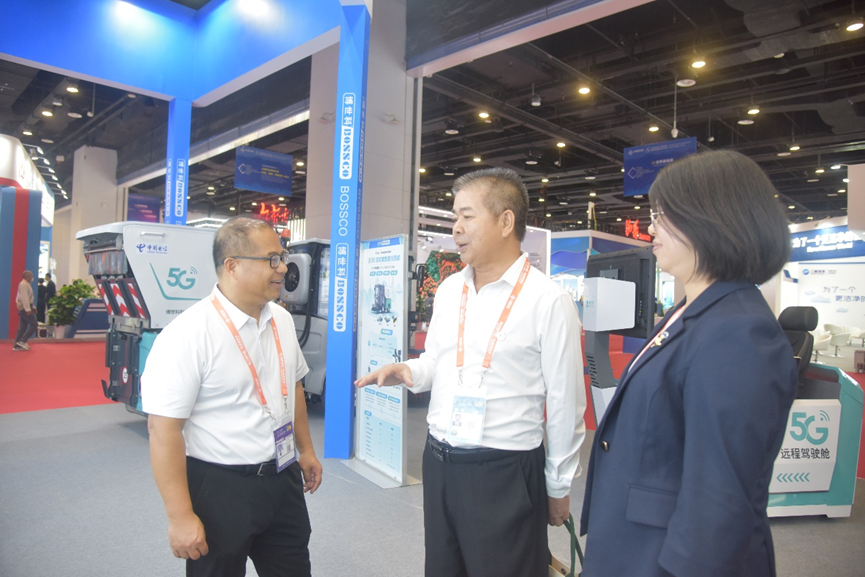 柬埔寨环境部环境知识与信息总局副局长威·卡迈勒(Uy Kammal)莅临博世科展位,了解博世科核心技术及海外项目情况,详细了解博世科自主研发的5G远程驾驶扫路机,指出该车拥有中国的先进技术,可以在柬埔寨和东盟国家有很多应用场景。