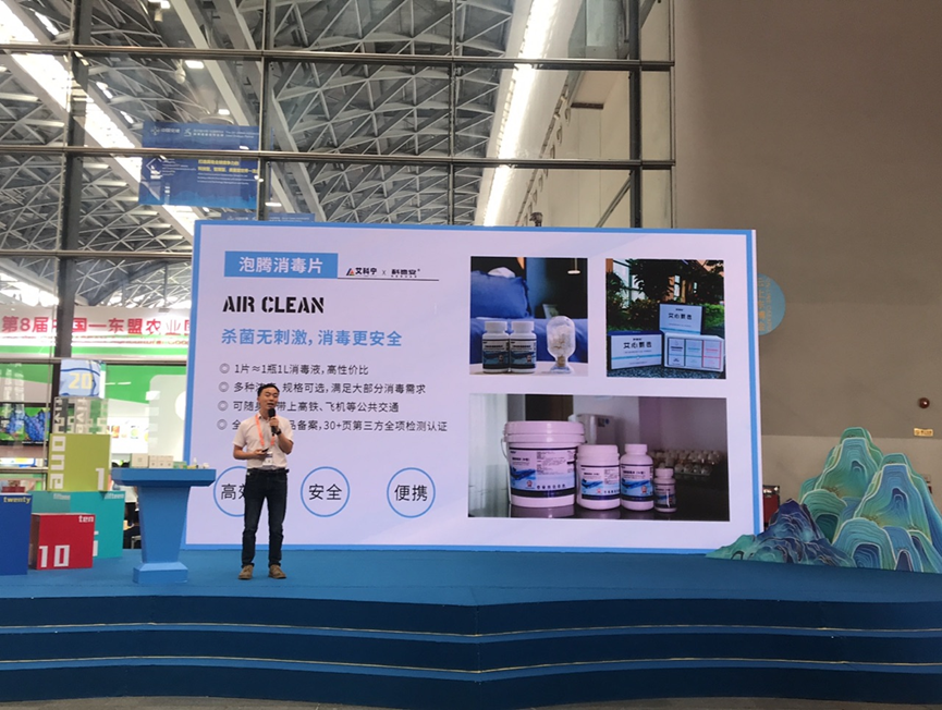 在第20届东博会新品首发首秀舞台上,博世科旗下艾科宁公司总经理王爱对首发的新品进行推介,让来自世界各地的参展商看到了民用二氧化氯消毒产品的魅力和商机。