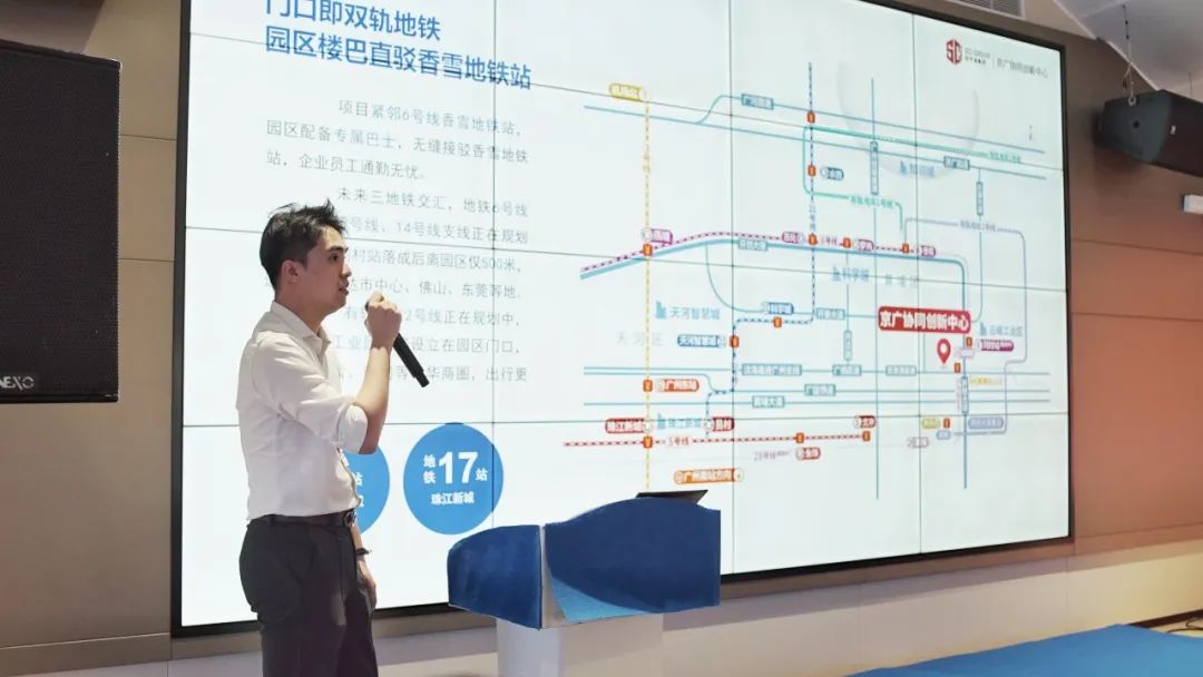 京广协同创新中心负责人方腾通过政策扶持、区位优势、品牌背书、产品配套等方面对京广协同创新中心进行了全面推介。京广协同创新中心作为以新一代信息技术、人工智能、医疗器械、高新服务业为主的新型“摩天工坊” ,将打造集研发、办公、生产于一体的高端科技园区,引领产业园发展新趋向。