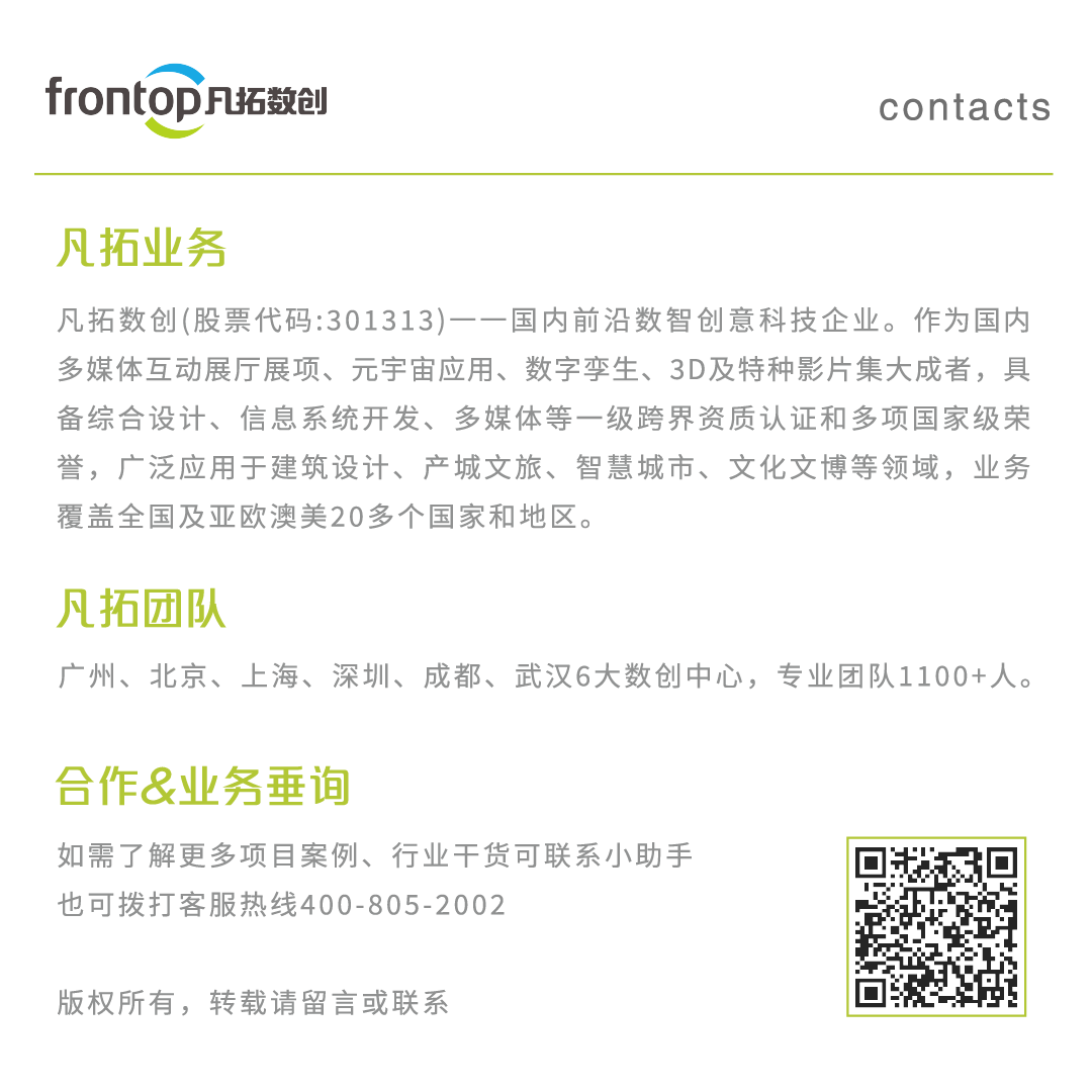过往招商展厅追崇的是高科技手段,随着元宇宙创意的不断升级,元宇宙场景化运用逐渐成为新一代的展示形式。凡拓数创数智营销体系通过以数字IP、数智影片、沉浸式展厅展项、全媒体运营等全周期布局,创建“线上+线下”的多维运用场景。
