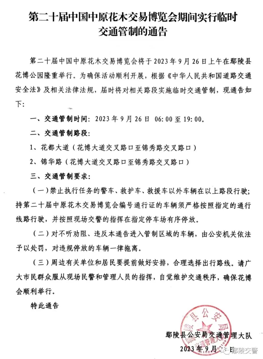 第二十届中国中原花木交易博览会期间实行临时交通管制的通告