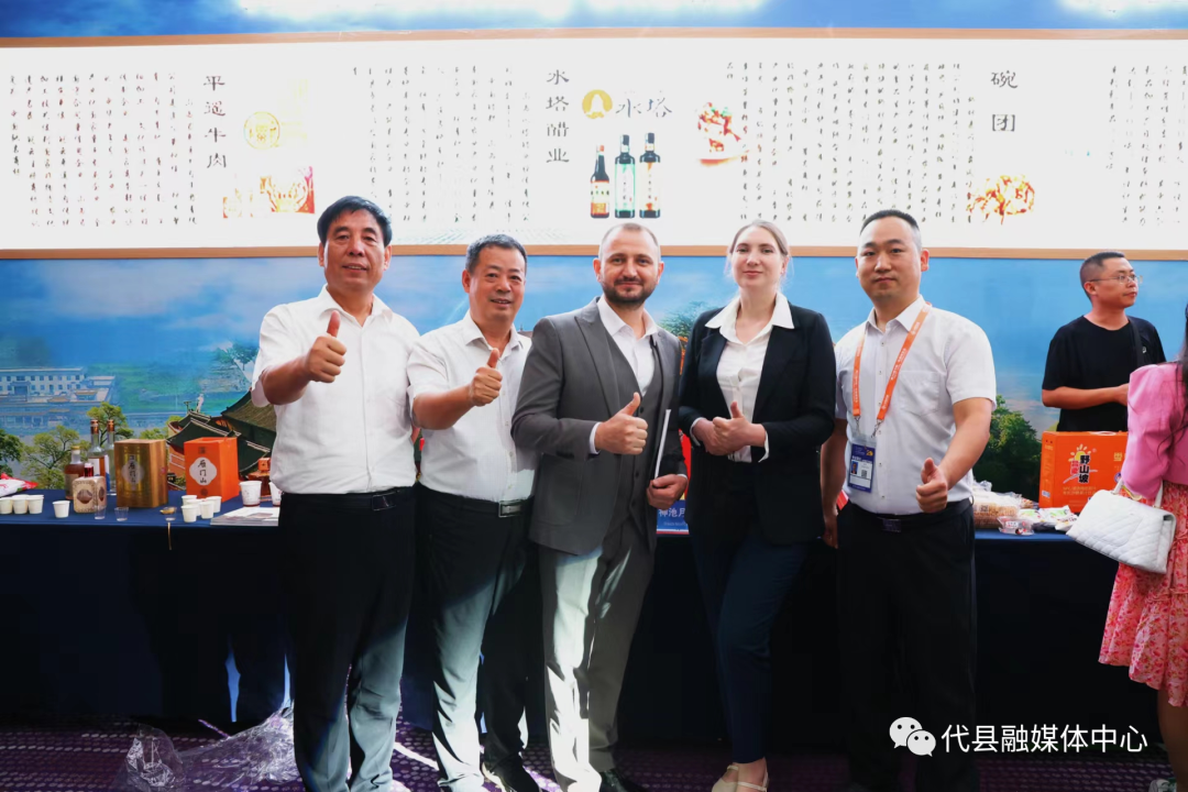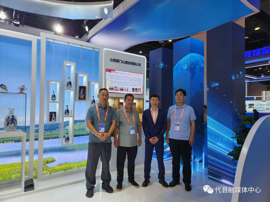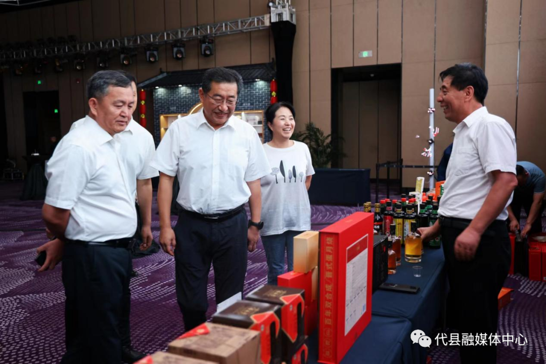山西省商务厅厅长王宏晋、山西省投资促进局副局长刘伟、忻州市商务局副局长张佩文、忻州市招商投资促进服务中心指导酒企参展并向客商做产品推介。(代县招商投资促进服务中心)