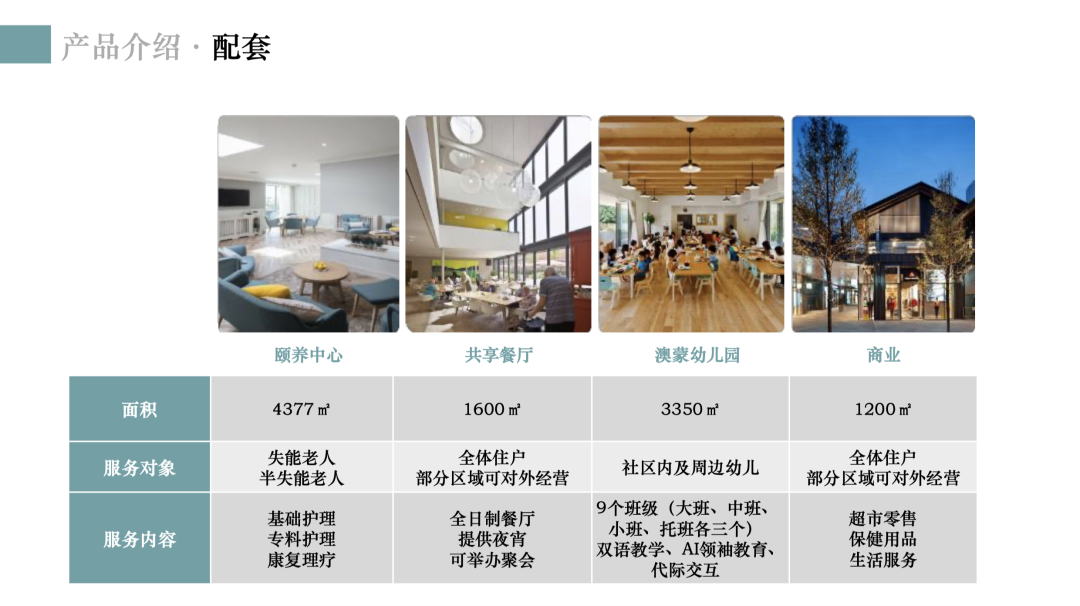 配套产业:老年食堂、日间照料中心、青少年科普活动中心、文体活动中心等