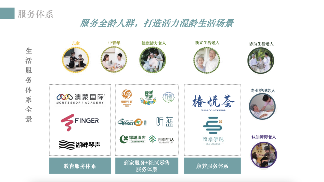 配套产业:以同城颐养+混龄社区+医养结合的模式,椿龄物业、颐养中心(24小时护理、360个子项颐养服务),绿城酒店、日间诊所、生活超市、颐乐学院、幼儿园等