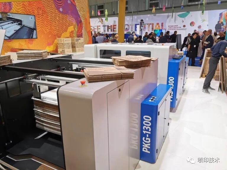 柯尼卡美能达在展台上展出了 PKG-1300 数字印刷机,该设备专为短版、按需瓦楞纸板和纸箱印刷而设计。该设备由 MTEX OEM 生产,具有与 NS Flexpack 相同的基本打印引擎。虽然 PKG-1300 是在春季推出的,但却是首次在大型展会上亮相。同样,它对小批量生产商而非大型瓦楞纸板印刷厂也很有吸引力。