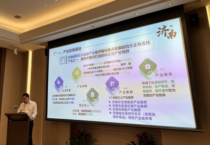会上,济南市工业和信息化局党组副书记、副局长魏斌从济南市医美健康产业发展基础、产业发展重点方向和政策措施等几个方面介绍了济南市生物医药与大健康发展情况。