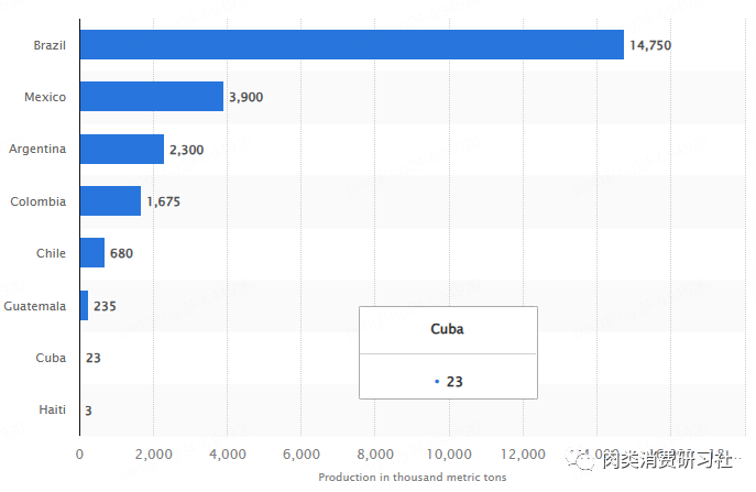 拉丁美洲各国鸡肉产量(单位:千吨)