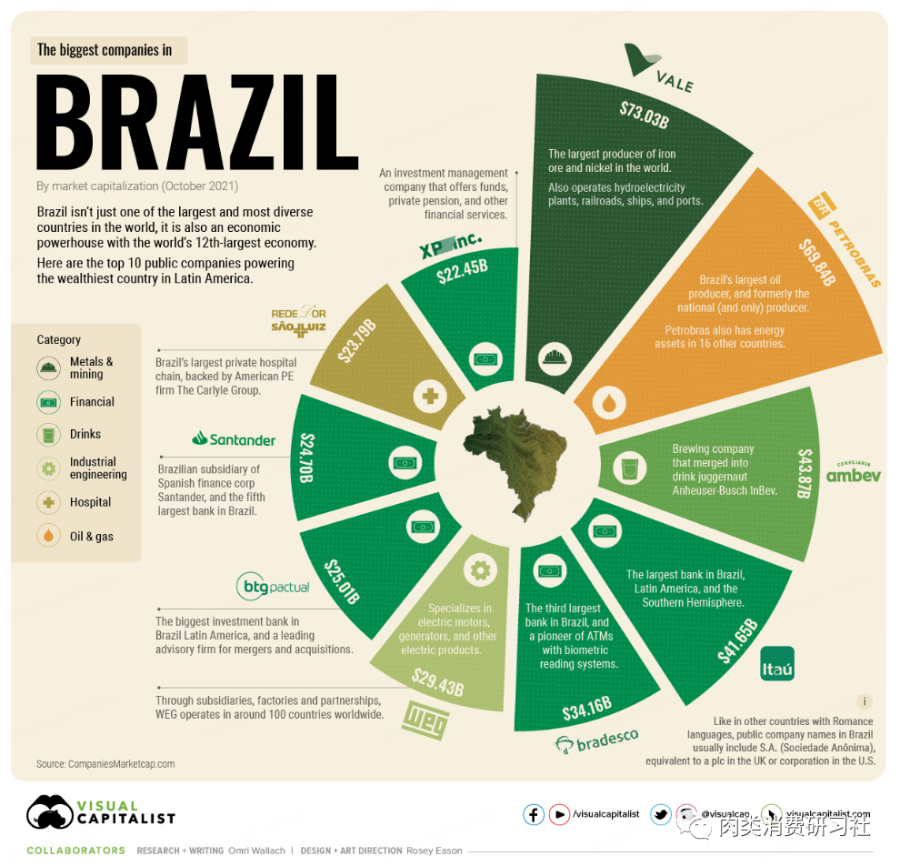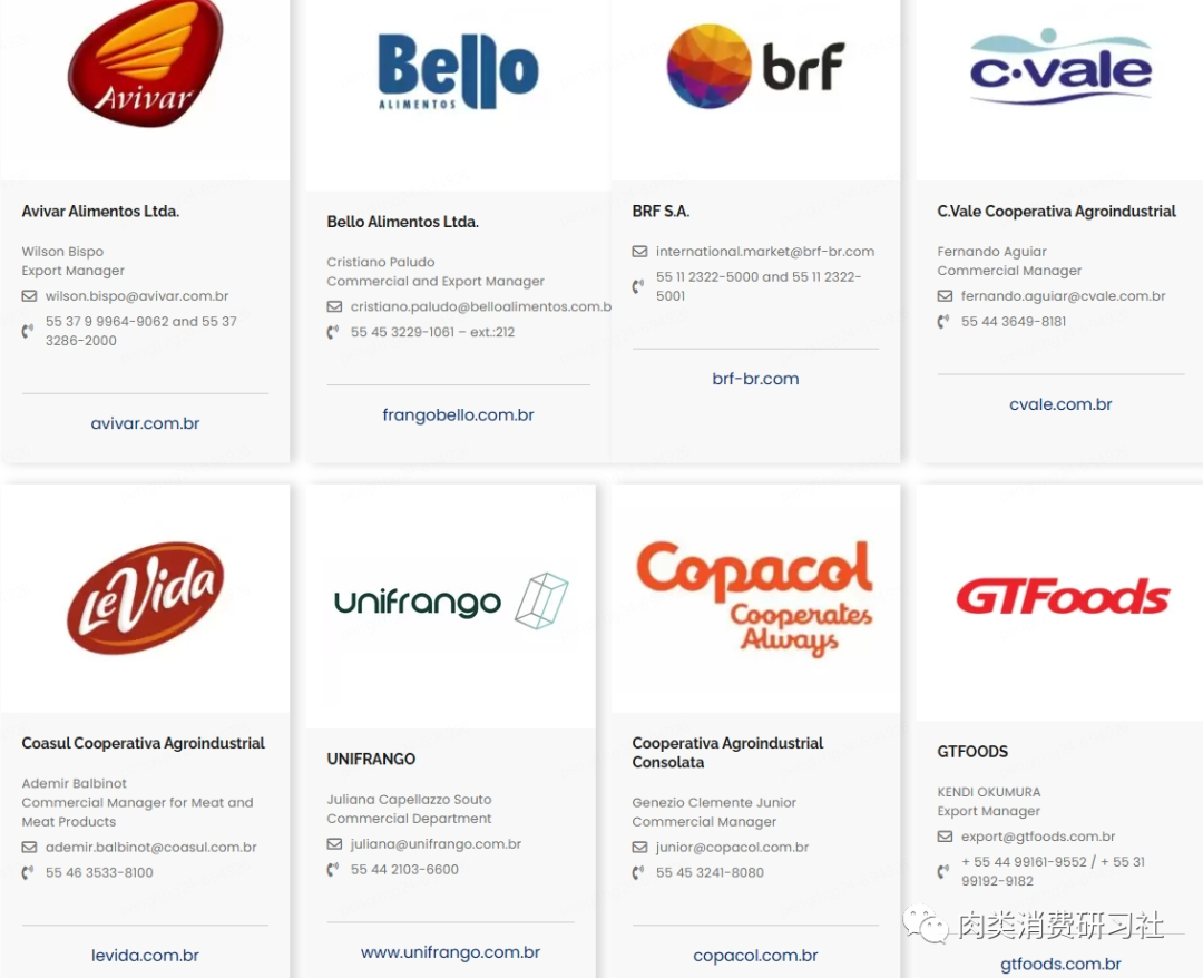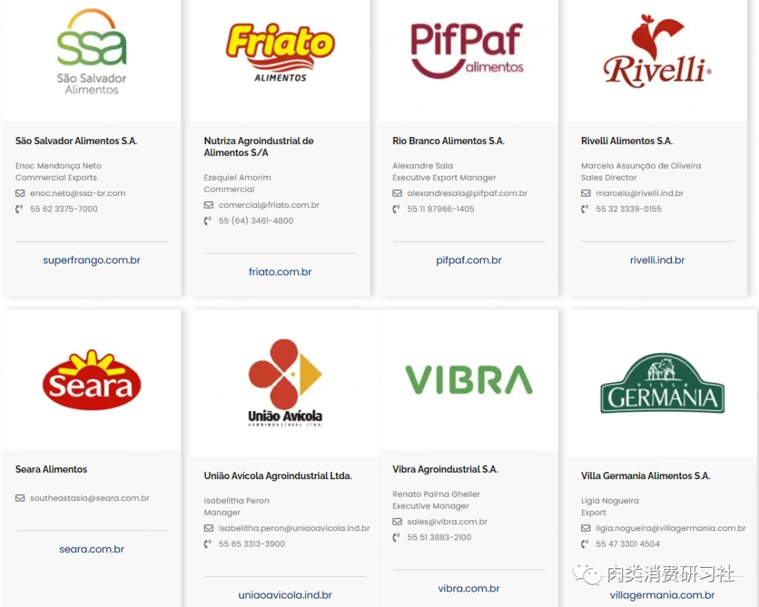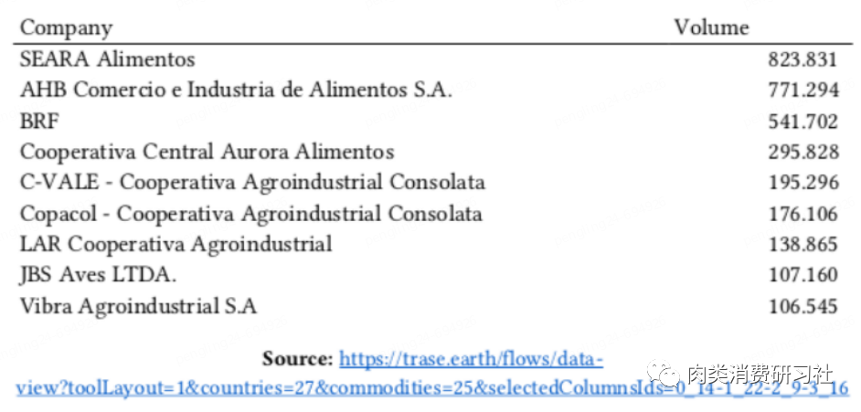 这些鸡肉出口由私营公司和合作社共同控制,其中大多数处于垂直整合的生产系统中。占据主导地位的都是巴西公司。最大的公司是世界上最大的肉类包装商BRF、SHB和SEARA,四个合作社也很重要,它们的出口量几乎与主要出口商SEARA一样多。