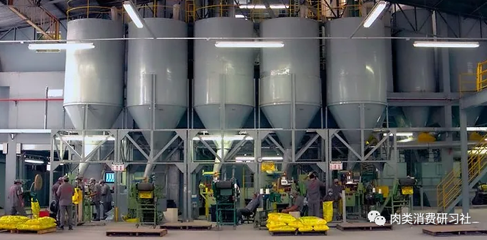 1967年,美国Purina公司在圣保罗建立了中心,Cargill公司于1970年成立,瑞士Roche公司于1972年成立。另一组供应商是巴西的饲料公司,这些公司大多是加工谷物的粮仓。按照其在美国经营模式,Purina公司开始为签约合同鸡畜提供免费饲料。到本世纪末,这种模式是用2公斤谷物饲料生产1公斤肉,最终鸡在出生后50天内就可以食用。在这种由谷物、维生素和药物组成的饲料中,谷物是最昂贵的成分,玉米占这种饲料成本的65%,豆粕或豆饼占20%。因此,肉鸡产业的演变和成本结构与巴西的玉米和大豆生产及其演变密切相关。