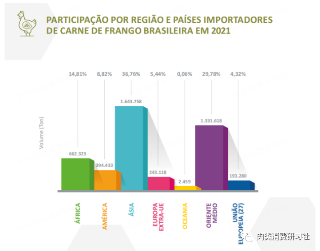 据估计,2021年1月至11月期间,巴拉那的肉鸡饲养平均成本中76%是食物,17%是其他一般成本,只有4%是劳动力,2%是资本成本。尽管巴西在世界各地出口鸡肉,但随着时间的推移,巴西产品的进口国和地区发生了变化。虽然最初欧洲与非洲和中东一样是主要进口国,但在2010年代,其对巴西鸡肉的购买量系统性下降。反过来,亚洲和非洲都在扩张,而中东仍然是一个稳定的购买者。中国是巴西主要的鸡肉进口国,占同期巴西出口的46%。