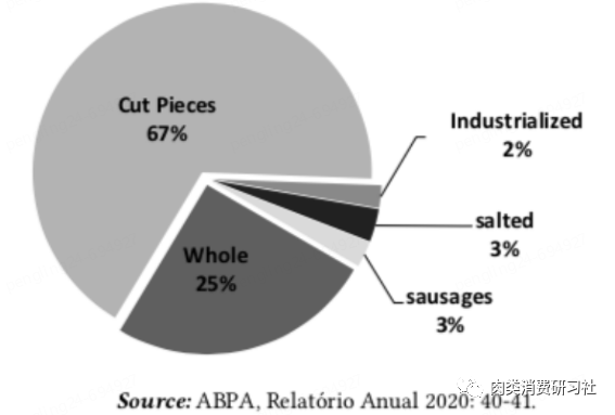 巴西鸡肉出口中,约三分之二的出口肉类是切块的,四分之一是整鸡。剩下的9%由咸肉、工业化产品和香肠组成(下图)。然而,这些出口存在地区差异。大多数清真鸡主要以整只鸡的形式出口。虽然世界大多数国家都集中于鸡肉部分的进口,但中东64%的进口是整鸡,而欧盟是唯一一个多样化的进口国,咸肉占进口的52%,鸡肉部分占25%。