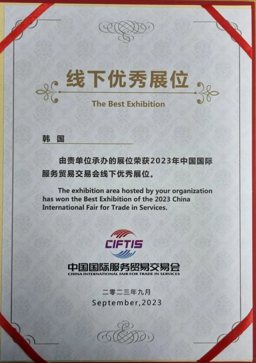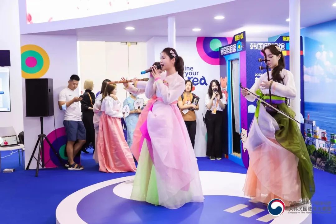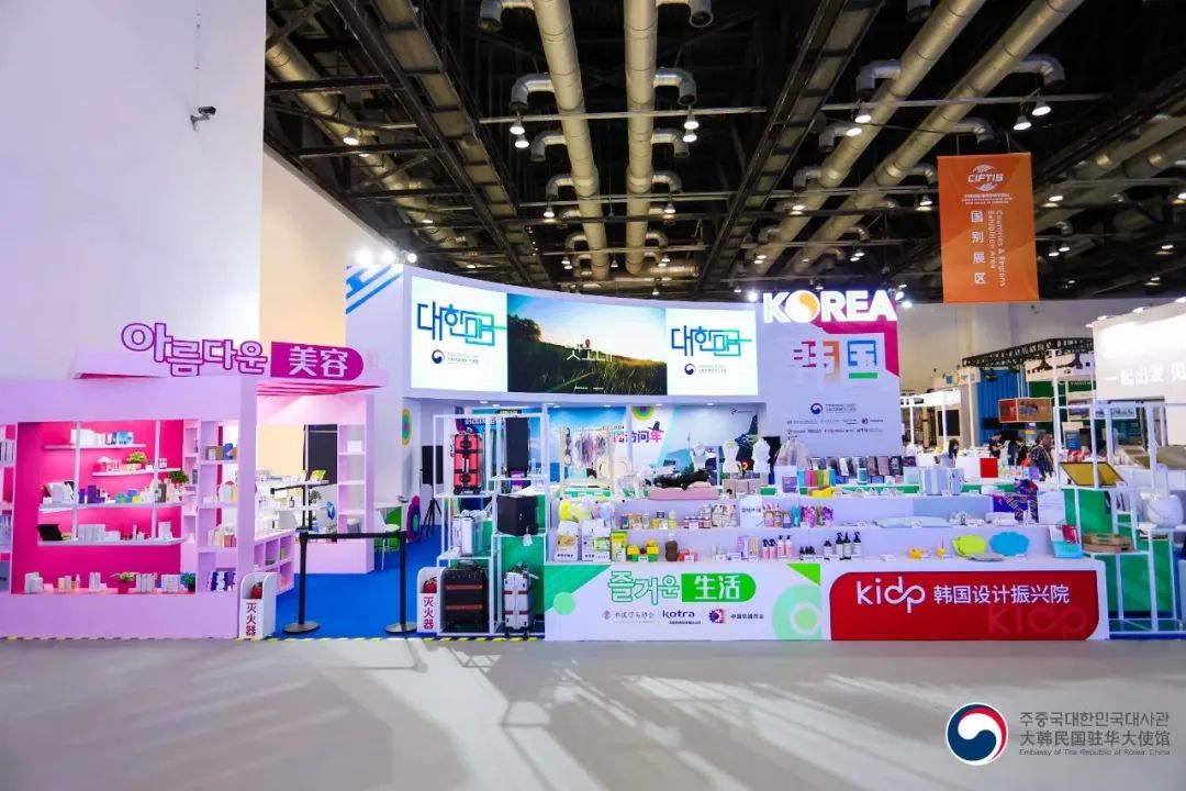 1. 韩国驻华大使馆在2023年9月2日至6日举办的“中国国际服务贸易交易会”上设立了韩国馆,并获得主办方颁发的线下优秀展位奖。※ 本届交易会共有59个国家参加并设立国家馆,其中6个国家及2个国际组织获得优秀展位奖2. 韩国馆是众多访客参观的展馆之一,为了宣传韩国企业及文化,有129家韩国企业参与,同时,韩国馆还提供韩服体验、混合K-pop演出等丰富多彩的活动。