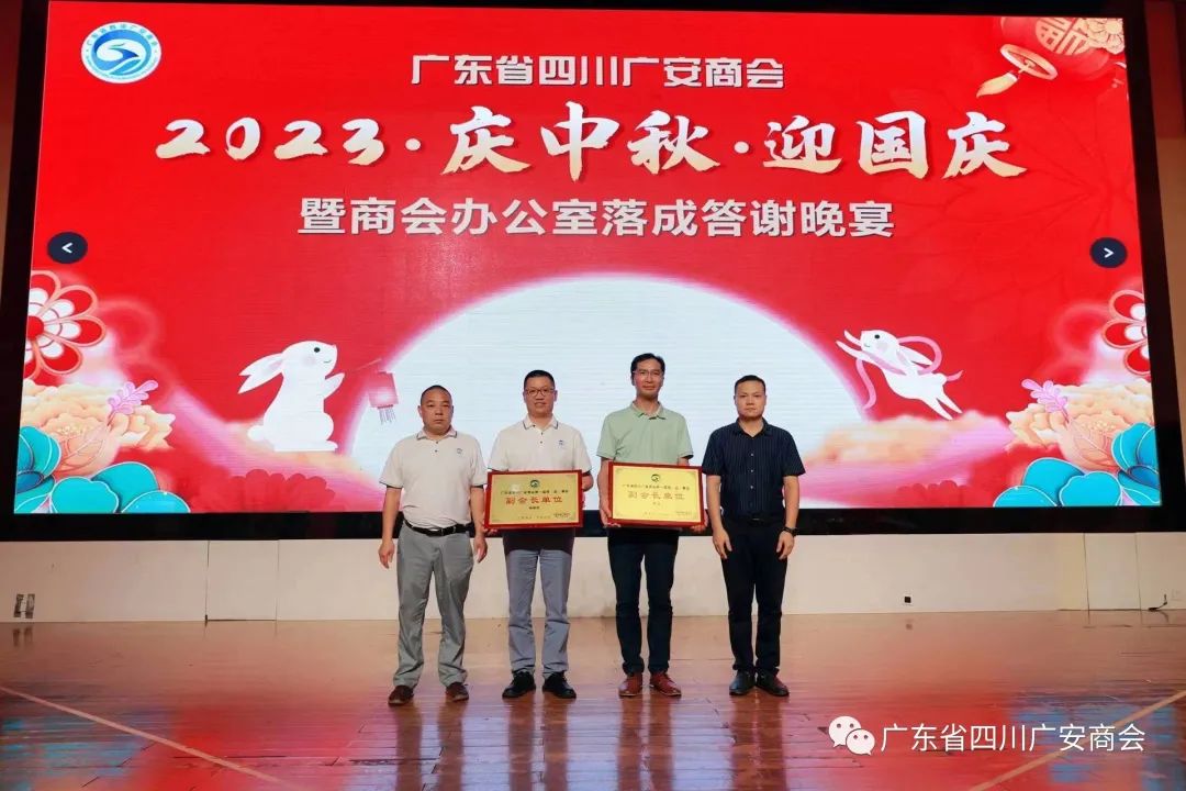 广东省四川广安商会执行会长吴昌云、左龙明执行会长为新晋副会长单位:广东税优优财税有限公司 杨银贵总经理,惠州市仙味坊食品有限公司 何力总经理授牌