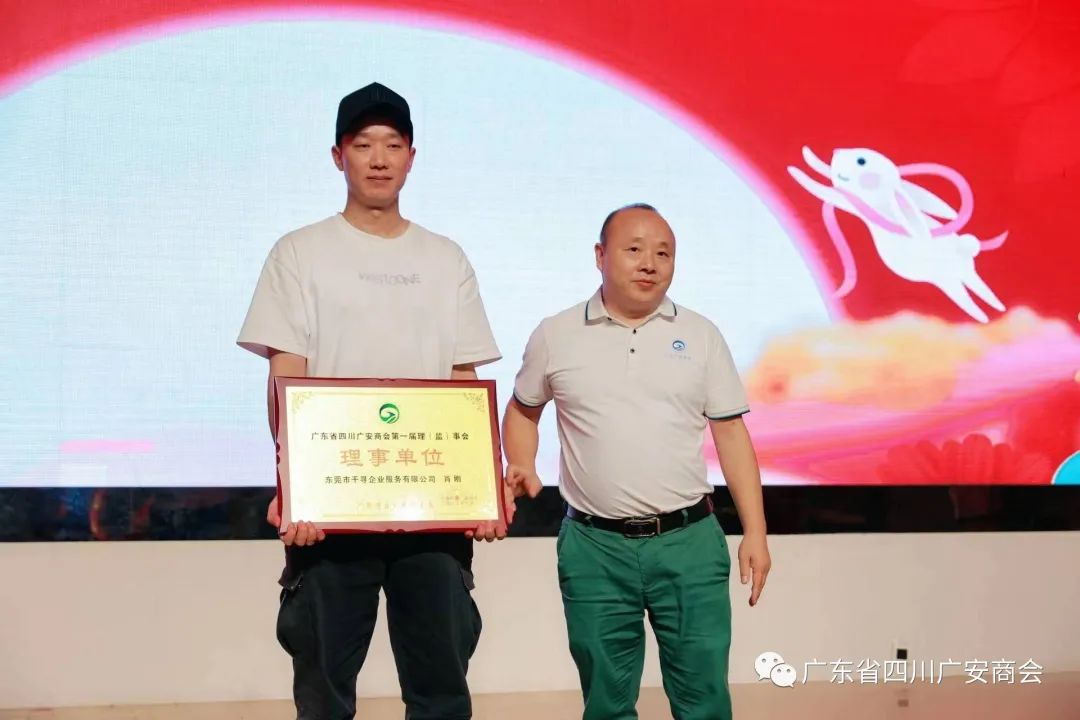 广东省四川广安商会陈德君理事长为新晋理事单位:东莞市千寻企业服务有限公司 肖刚总经理牌匾