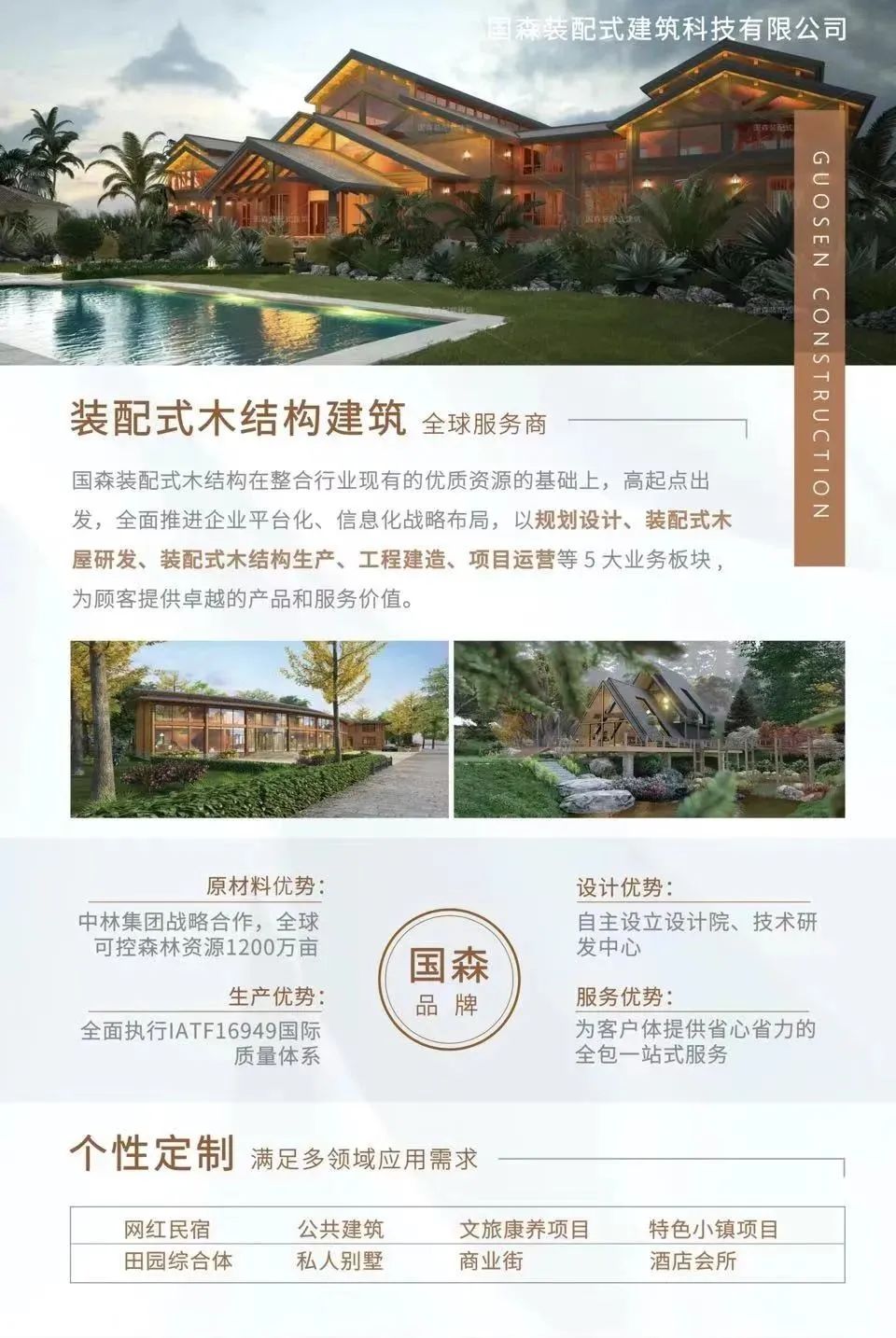 国森装配式木结构,提升项目综合运营能力“木屋+”以木结构为载体打造,具有鲜明特色的、高附加值的旅游住宿产品,提升项目硬实力、提升项目软实力、缩短项目开发周期降低时间成本,加快开发进度。