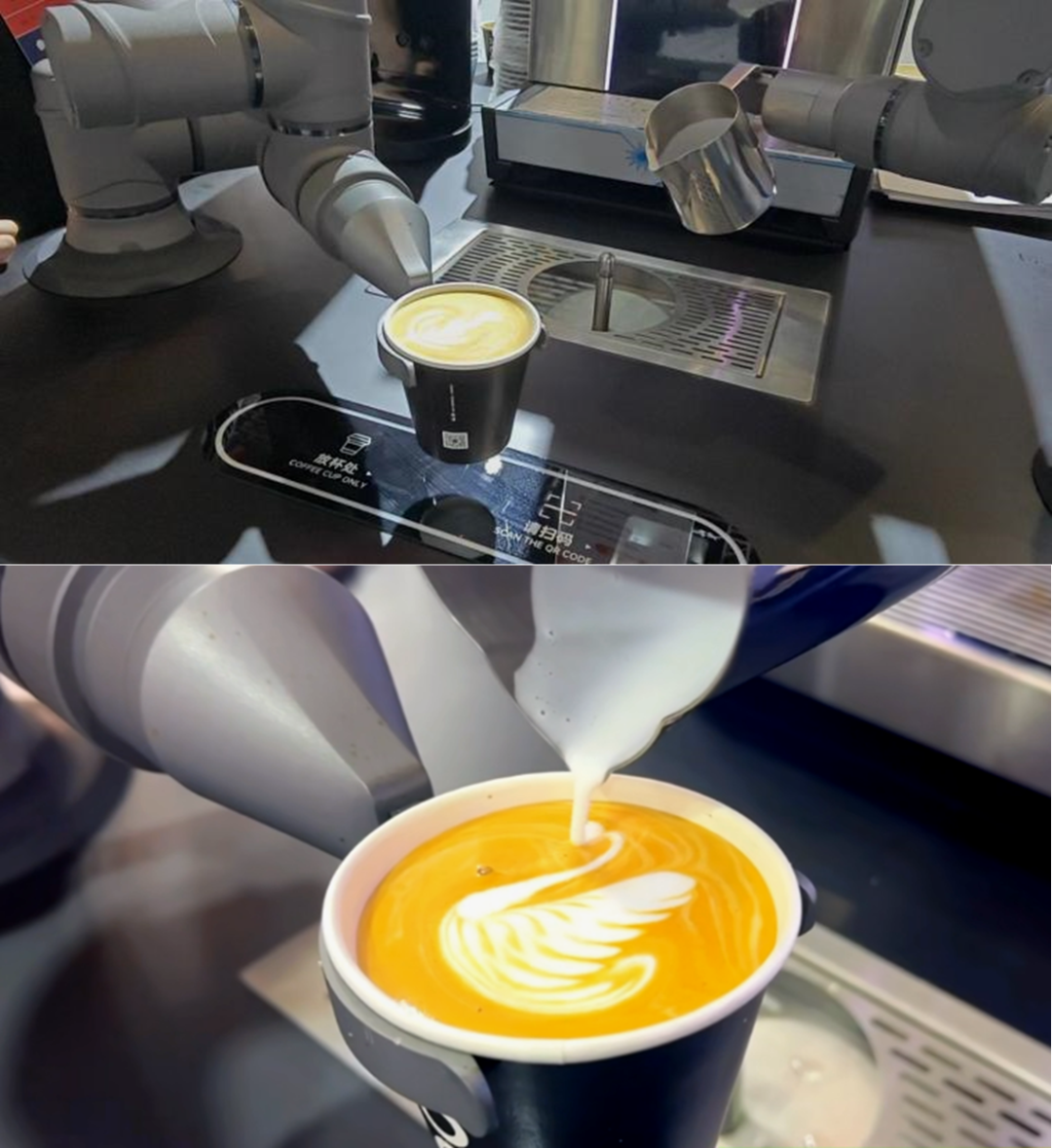 机器人展馆另一位流量明星,非拉花咖啡机器人莫属。它可在服务期间稳定输出1500余杯,双机臂在短短75秒即可完成大师级拉花咖啡,不愧为现场最靓最香的机器仔。