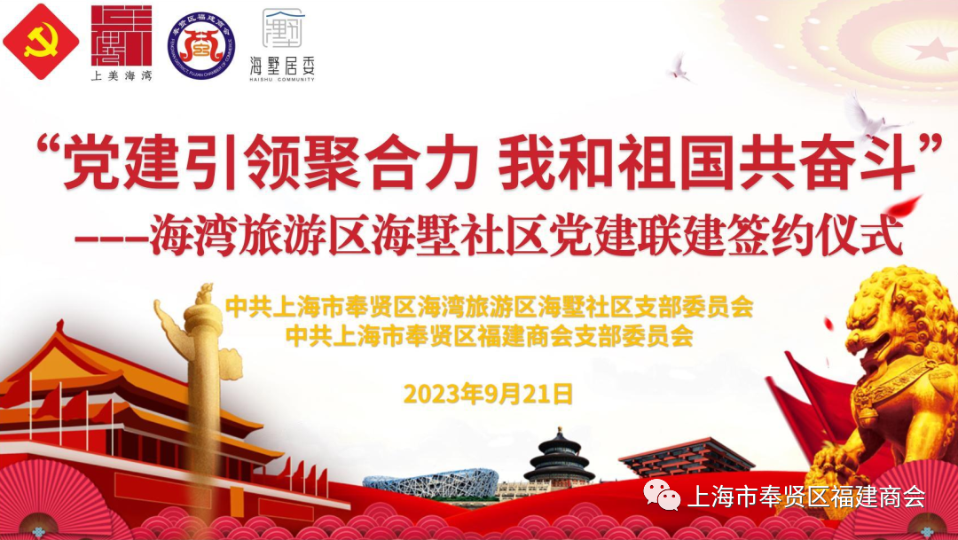 为深入学习贯彻习近平新时代中国特色社会主义思想主题教育,推动主题教育走实走深,充分整合区域化党建资源,9月21日下午,奉贤区福建商会党支部与海湾旅游区海墅社区党支部开展党建联建签约仪式。区福建商会党支部和海墅社区党支部党员代表,共40余人参加此次活动。商会秘书长毕春兰,商会常务副会长、商会党支部负责人林铭辉,党建指导员汪海良等出席了活动。会议由海墅社区党支部书记、居委会主任陈伟主持。