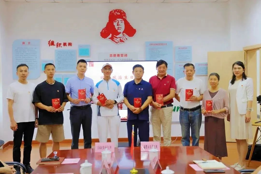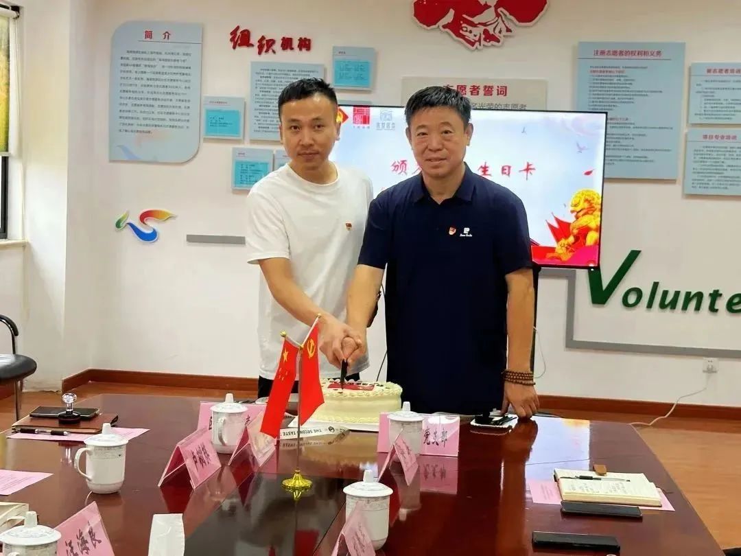 区福建商会党支部负责人林铭辉和海墅社区党支部书记、居委会主任陈伟颁发政治生日卡。