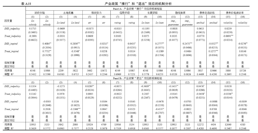 本文进一步基于政府支持、信用增进、信号传递、隐性担保和流动性风险五个影响渠道探究产业政策“推行”和“退出”非对称影响产生的机理,政府支持机制具体包括政府补贴、土地优惠和税收努力。具体而言: