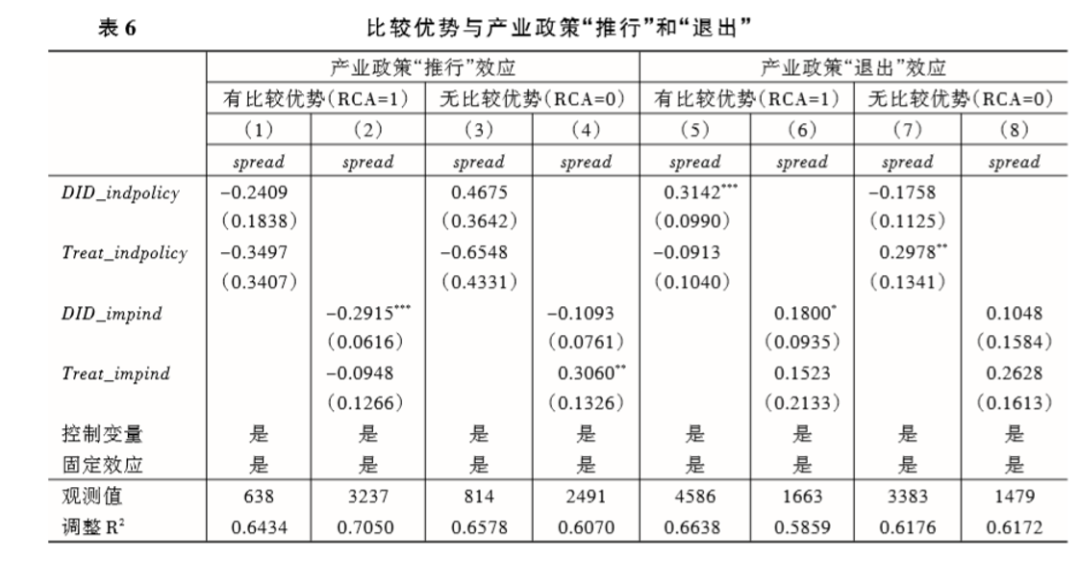 上述回归结果表明,虽然地方政府能够运用产业政策支持和培育无比较优势行业的发 展,但是产业政策效果远远不及有比较优势的行业。本文的研究结论验证了比较优势在产业政策 有效性中的关键作用。