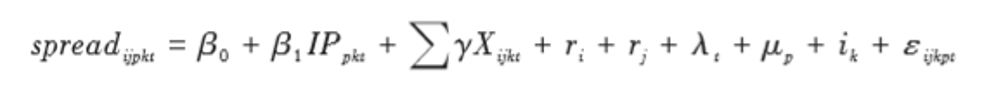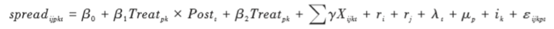 其中, i表示债券, j表示发债企业, p表示省份, k表示行业, t表示年份。被解释变量spreadijpkt表 示属于省份p行业k的企业j在第t年发行债券i的发行利差。核心解释变量IPpkt为代表地方产业政 策的虚拟变量,包括一般产业政策(indpolicy_ prov)和重点产业政策(impind_ prov),表示省份p在第t 年是否鼓励(重点)支持发展行业k。Xijkt为一系列控制变量,包括债项特征、企业特征和财务变量。ri、 rj、 λt、 μp 和ik 分别表示债券信用评级、发债企业信用评级、年份、省份和行业的固定效应。εijkpt 为 随机扰动项。虽然式(1)可以认为是广义的双重差分模型,但是这样的设定忽略了地方产业政策的选择和制 定是随着时间动态变化的,导致估计模型无法区分产业政策的“推行”和“退出”效应。因此,本文进 一步基于政策连续性的视角,构建如下双重差分模型进一步考察地方产业政策“推行”与“退出”对 企业融资成本的影响: