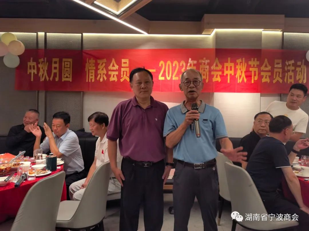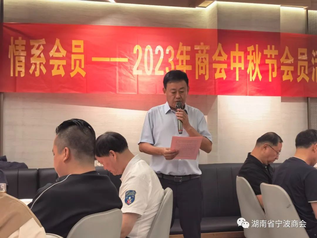9月22日,湖南省宁波商会、长沙市宁波商会举办“中秋月圆 情系会员”暨庆国庆迎中秋会员活动,在湘的宁波籍部分会员企业,老乡及朋友相聚在羊城佳宴酒楼,大家欢聚一堂,共话家事,共抒乡情。活动特别邀请了国防科技大学政治部原主任徐子怀、省委原副秘书长钟万民、国防科技大学大校蔡学武、湖南省公安厅刑警总队原队长龚德龙、湖南省委办公厅原领导秘书康进等社会各界朋友参加。