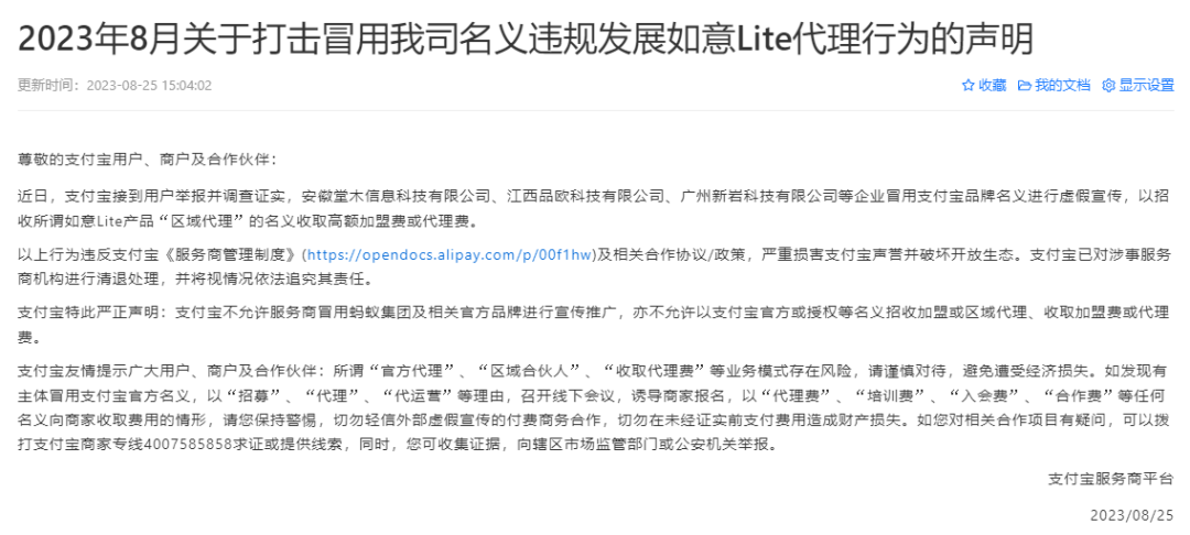 日前,支付宝发布了“2023年8月关于打击冒用我司名义违规发展如意Lite代理行为的声明”。
